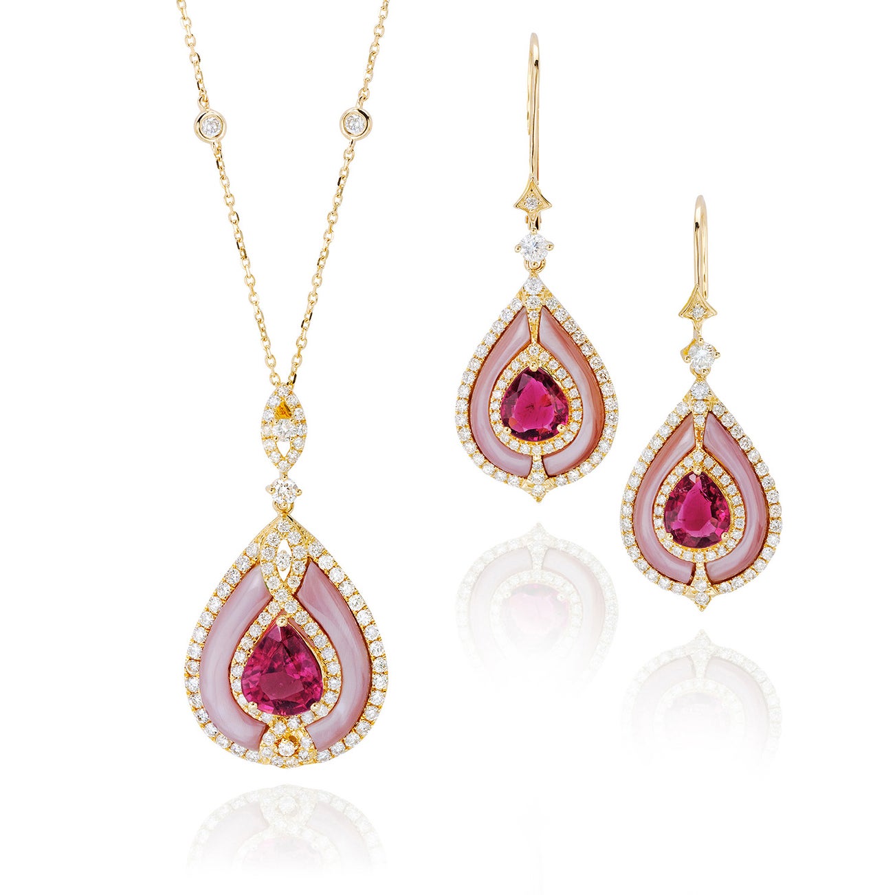 A Set of Rubellite, Mother-of-Pearl, Diamond, and Gold Jewelry