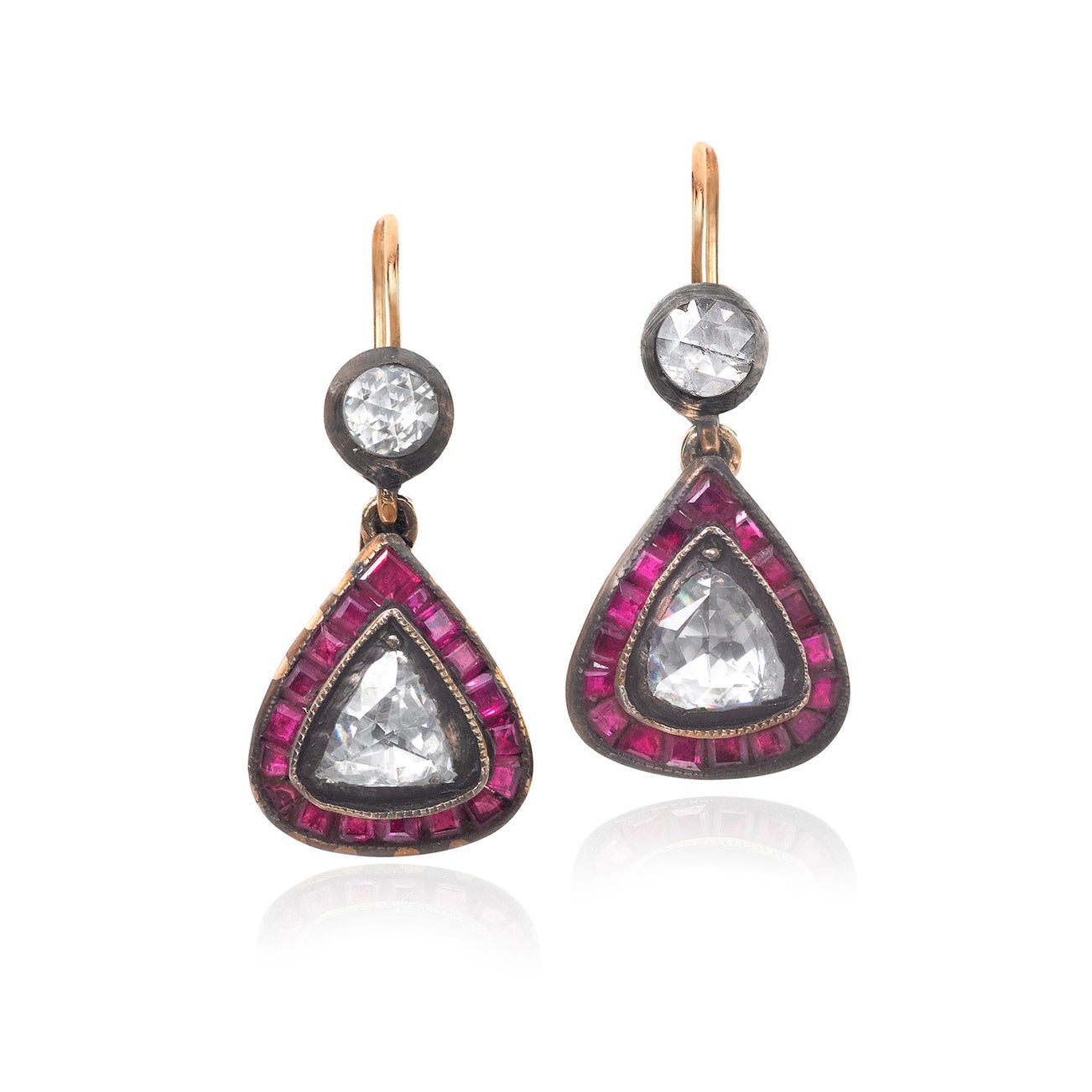 A Russian Pair of Diamond, Ruby, and Silver-Topped Gold Earrings