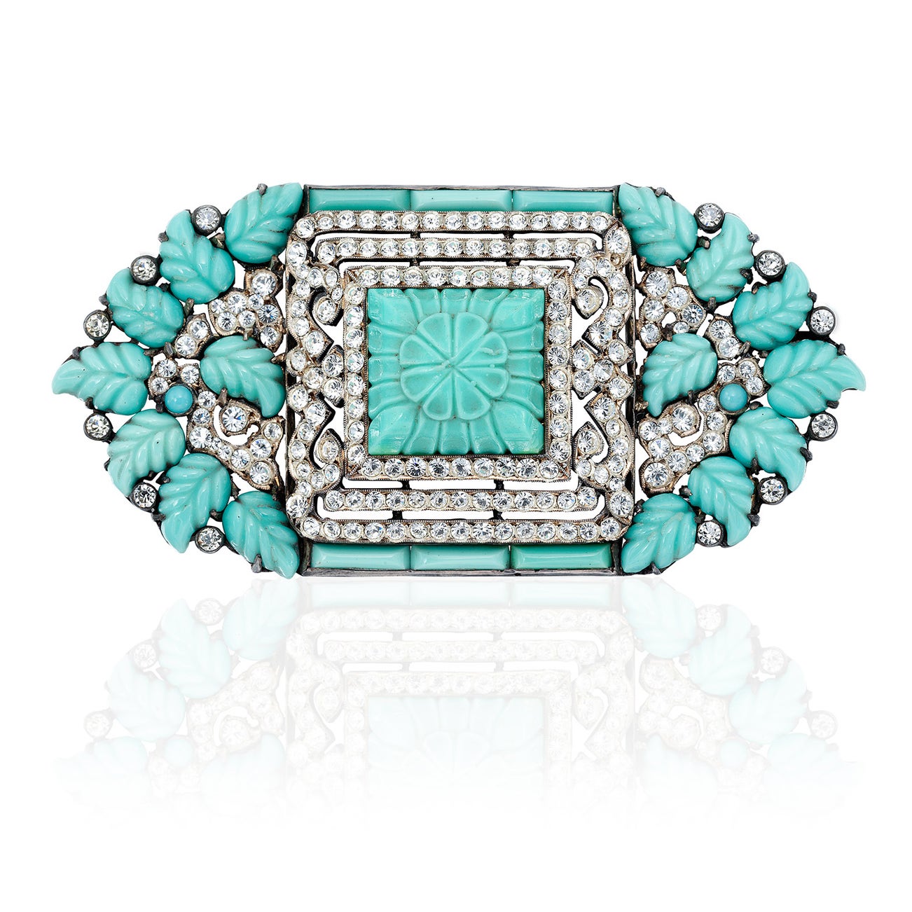 Paste jewelry has a long tradition dating back to ancient Greece when glass was used to imitate precious stones. These glass imitations remained relatively unchanged until 1674 when George Ravenscroft, an English glass maker, invented and patented a new gemstone imitation with a higher lead oxide content increasing the fineness and refractive index of the stones making them more closely resemble diamonds. Often these paste stones were silver backed, color foiled backed, or painted to achieve convincing imitations. Paste grew immensely in popularity when Georges Frederic Stras began crafting paste in the court of Louis XV that outshined most of the diamonds and gemstones of the time. Paste remained popular throughout history until modern mining increased the availability of diamonds and the cutting style of old European-cut diamonds became more refined and eventually transitioned to the modern brilliant-cut that we know today. Paste had a resurgence in the Art Deco period when costume jewelry was being featured with top couturiers such as Mainbocher, Schiaparelli, and Coco Chanel. Today antique paste in excellent condition remains desirable.