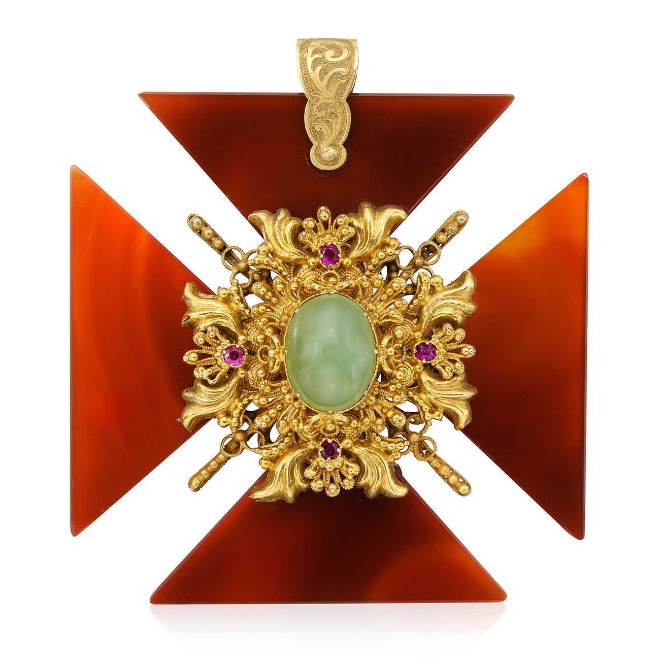 A Georgian Carnelian, Jadeite, Ruby, and Gold 'Momento Mori Maltese Cross' Pendant