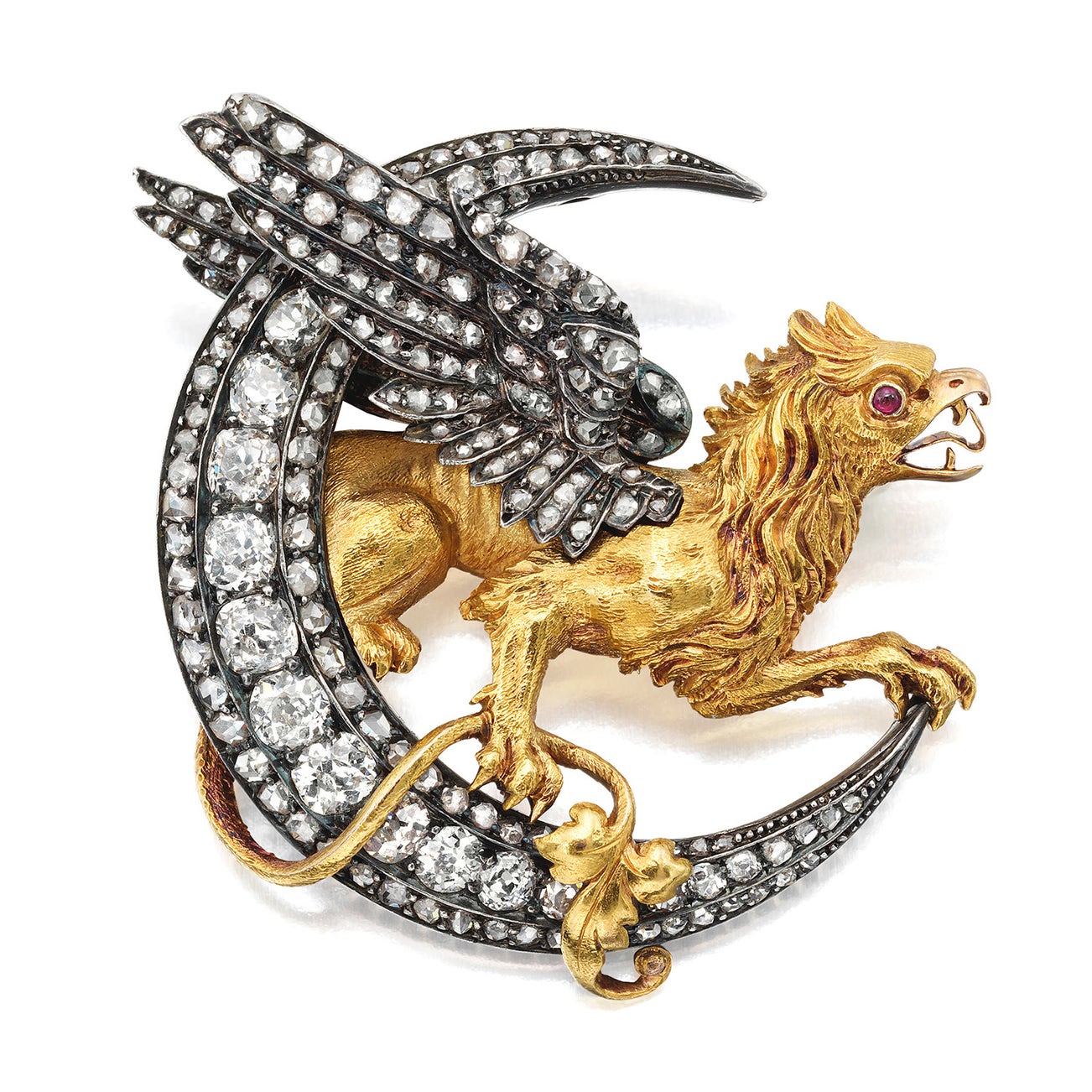 An Antique French Diamond, Ruby, Gold, and Silver-Topped Gold Brooch