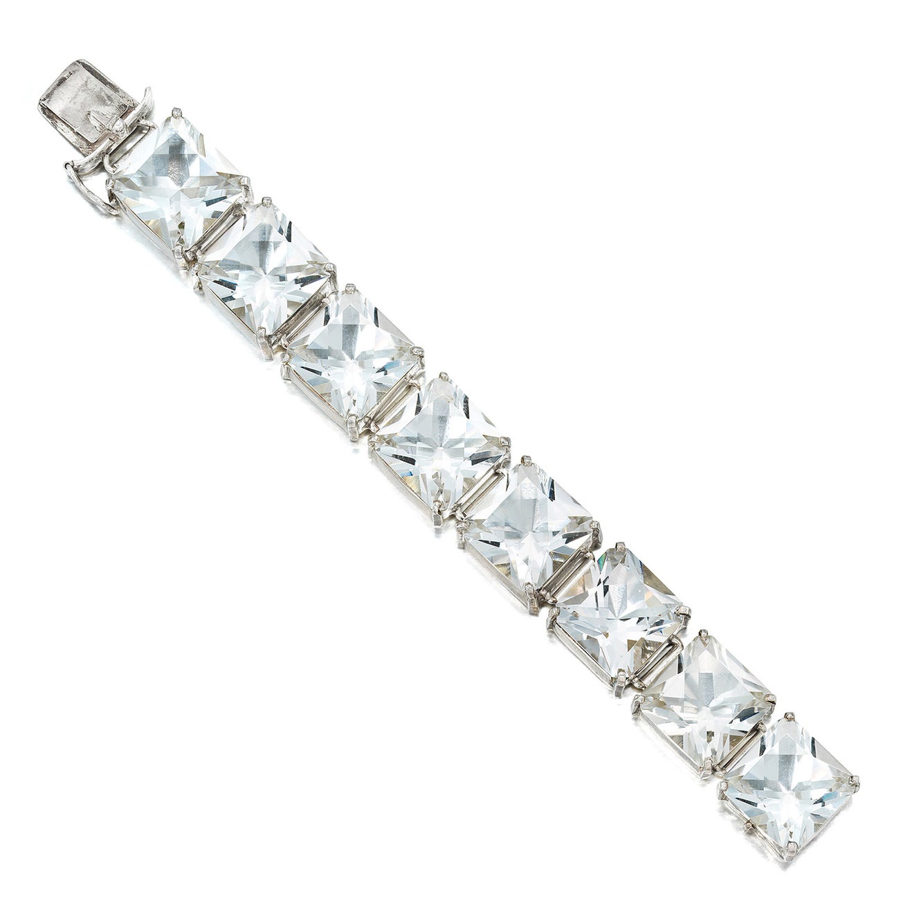 Rock crystal is a colorless quartz and named from Greek for ice, ‘krystallos’. Over the centuries it has been used for a multitude of uses, such as glazing for memento mori and jewels enclosing hair, time pieces, orbs or ‘pools of light’, and even as diamond simulants. Georgian jewelers commonly created rivière of silver backed cushion-shaped rock crystal in collet settings. They would often paint a black dot on the culet to simulate the scintillation or flashes of light and dark in natural diamonds. These are often referred to Stuart crystals and black-dot rock crystal. Few survive today as many were sacrificed to different war efforts throughout history. We are delighted to be able to offer such a well-preserved example.