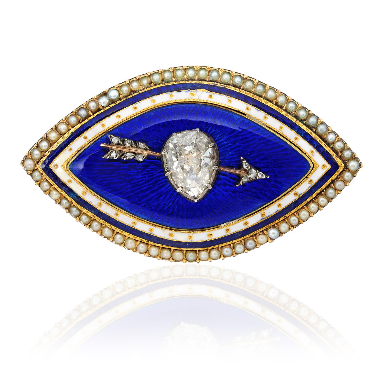 A Georgian Diamond, Pearl, Enamel, Silver, and Gold Brooch