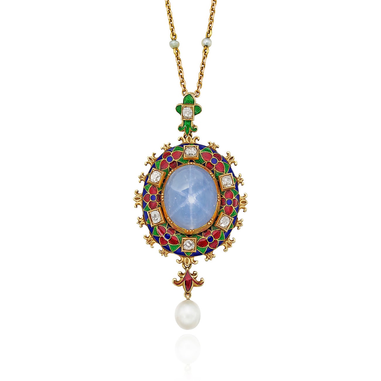 A Holbeinesque Star Sapphire, Diamond, Pearl, Enamel and Gold Pendent Necklace