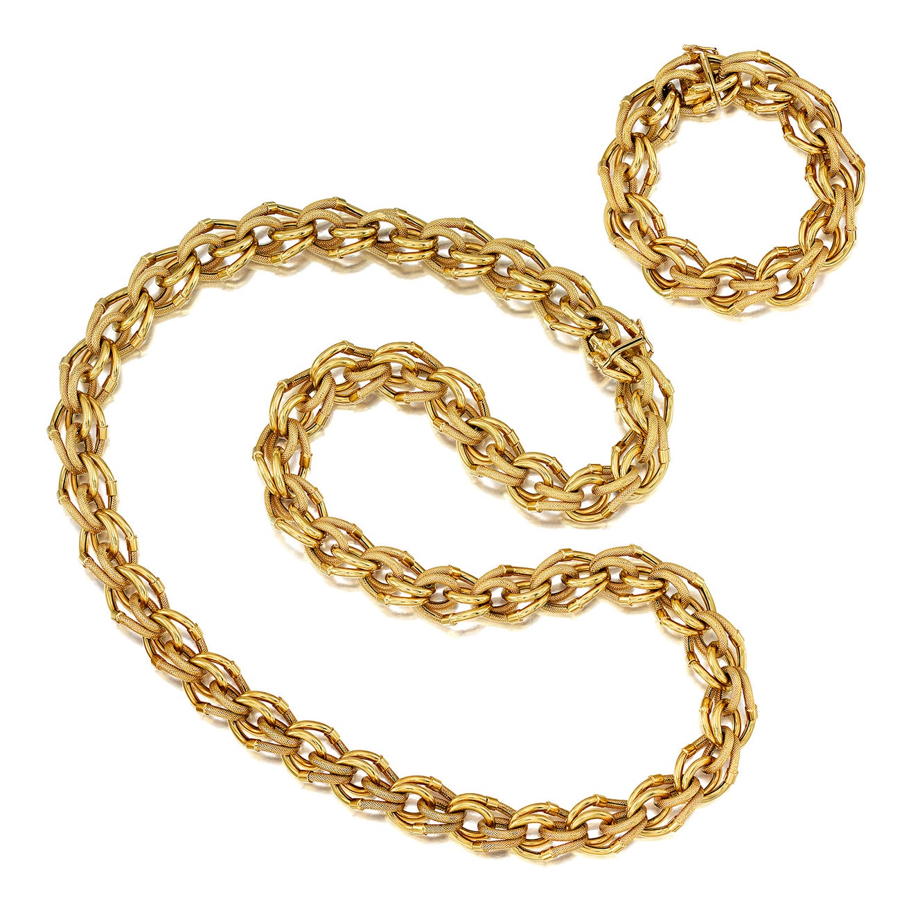 18K yellow gold, length of necklace approximately 32 inches, length of bracelet approximately 7 3/8 inches