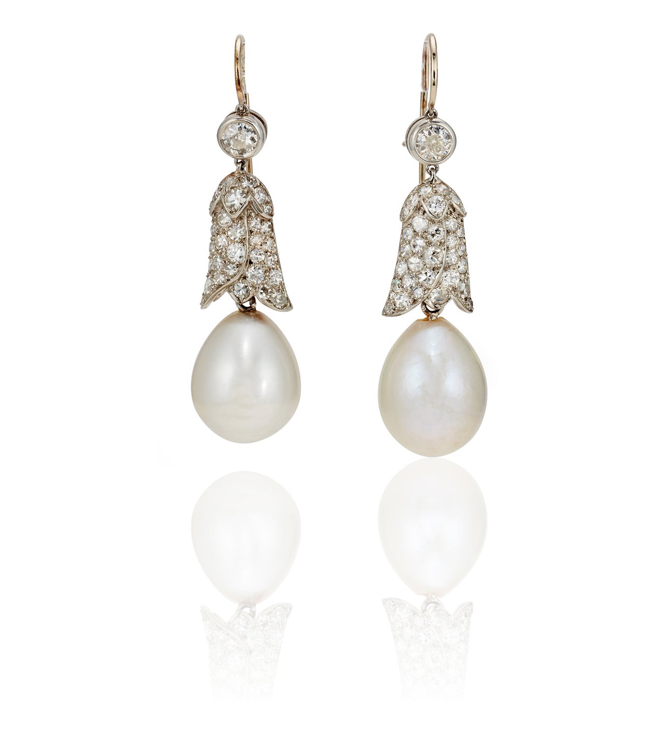 Pair of Natural Pearl, Diamonds, and Platinum Earrings