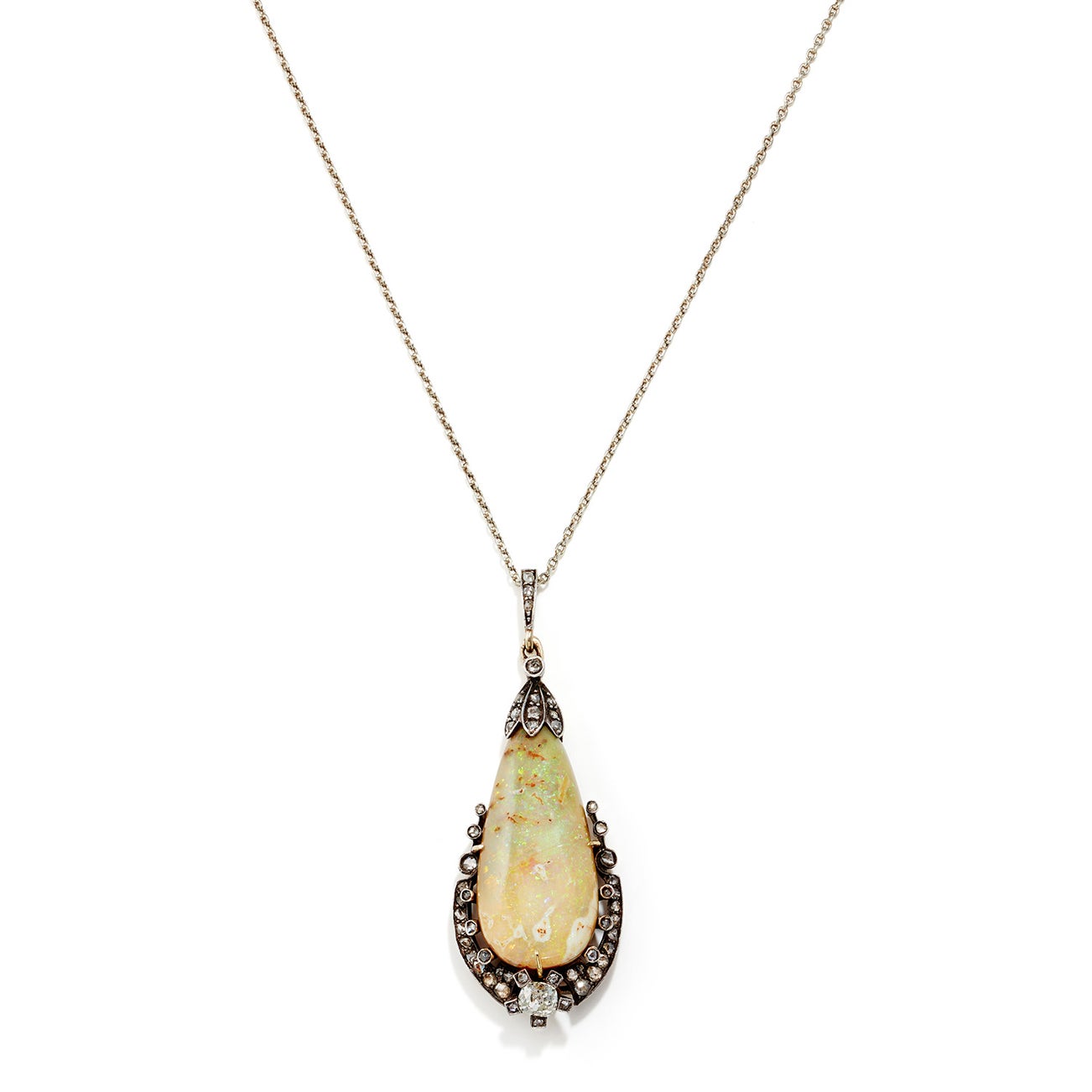 A Victorian Opal, Diamond, Silver Topped-Gold Pendant Necklace