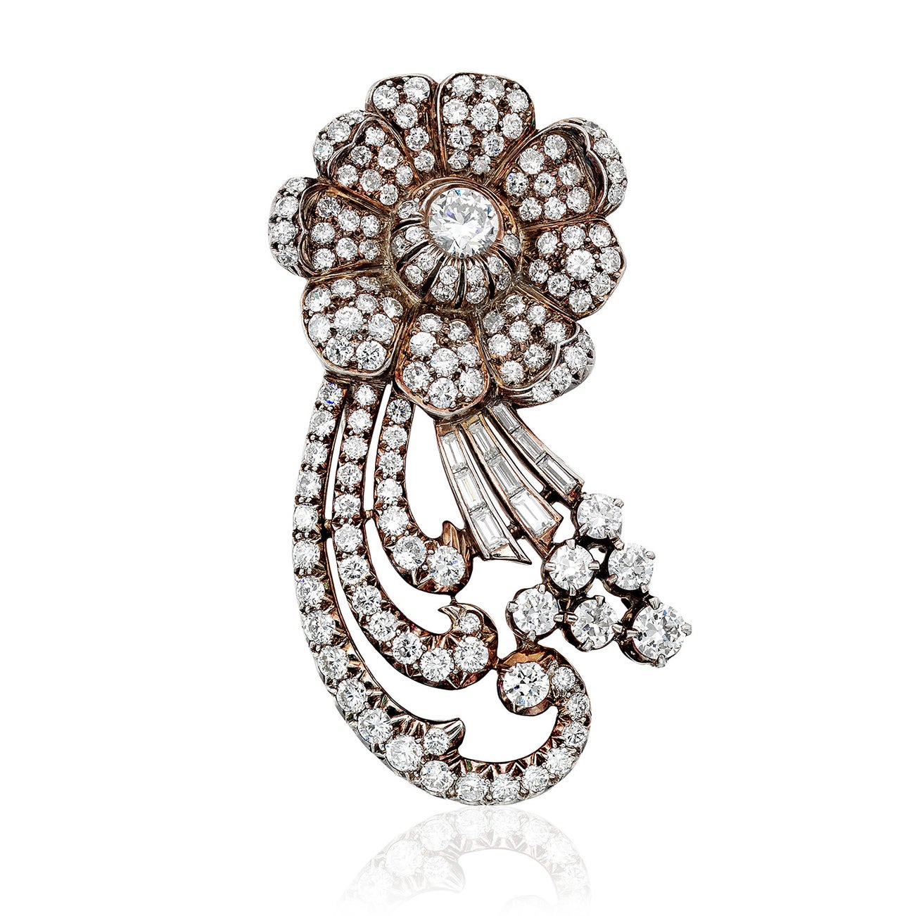 Old mine-cut, round brilliant-cut, and baguette-cut diamonds, total approximately 4.15 cts.