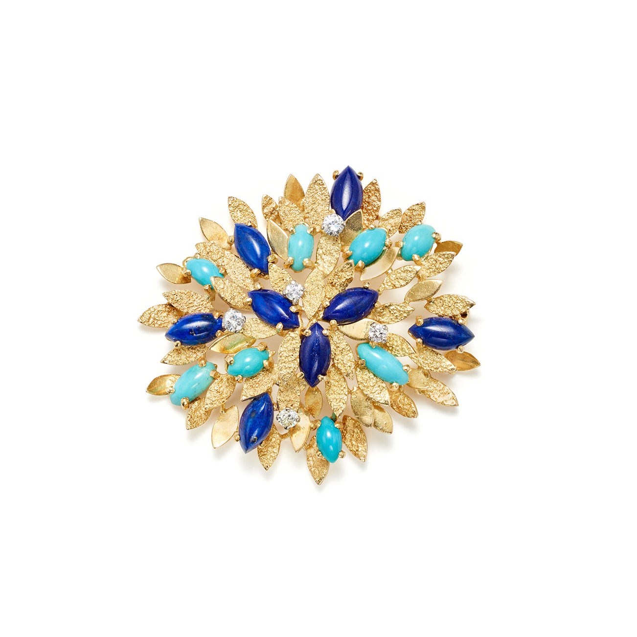 A Diamond, Lapis Lazuli, Turquoise, and Gold Brooch