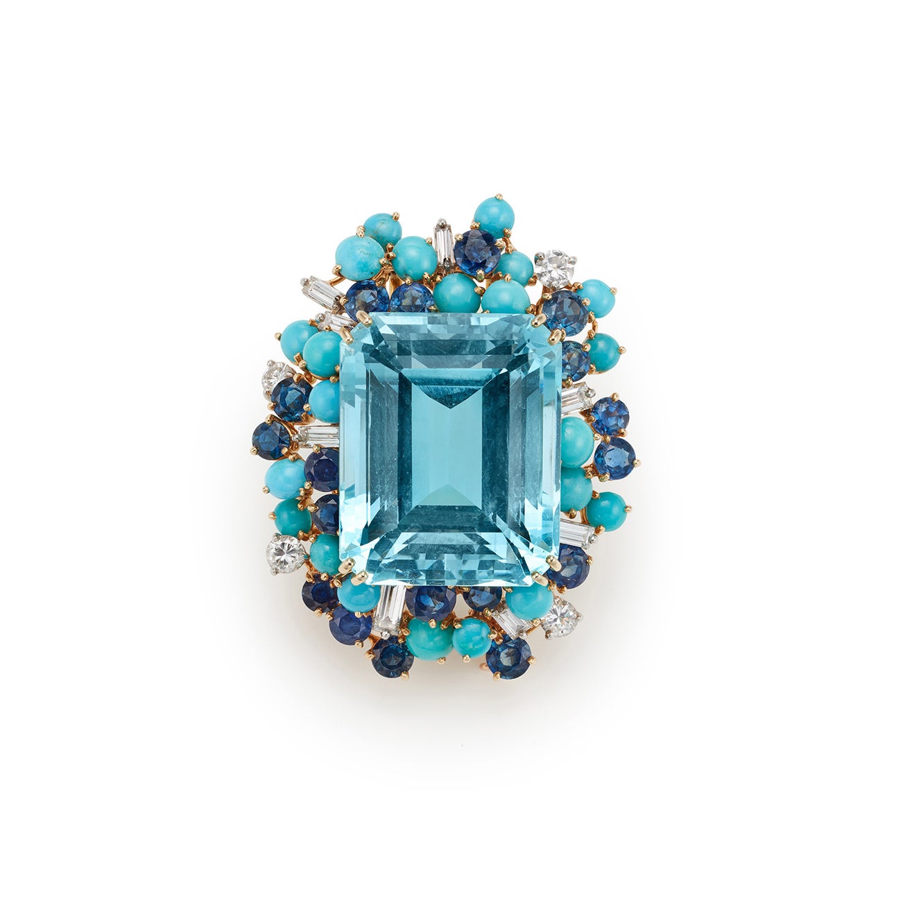 A French Aquamarine, Sapphire, Turquoise, Diamond, and Gold Brooch
