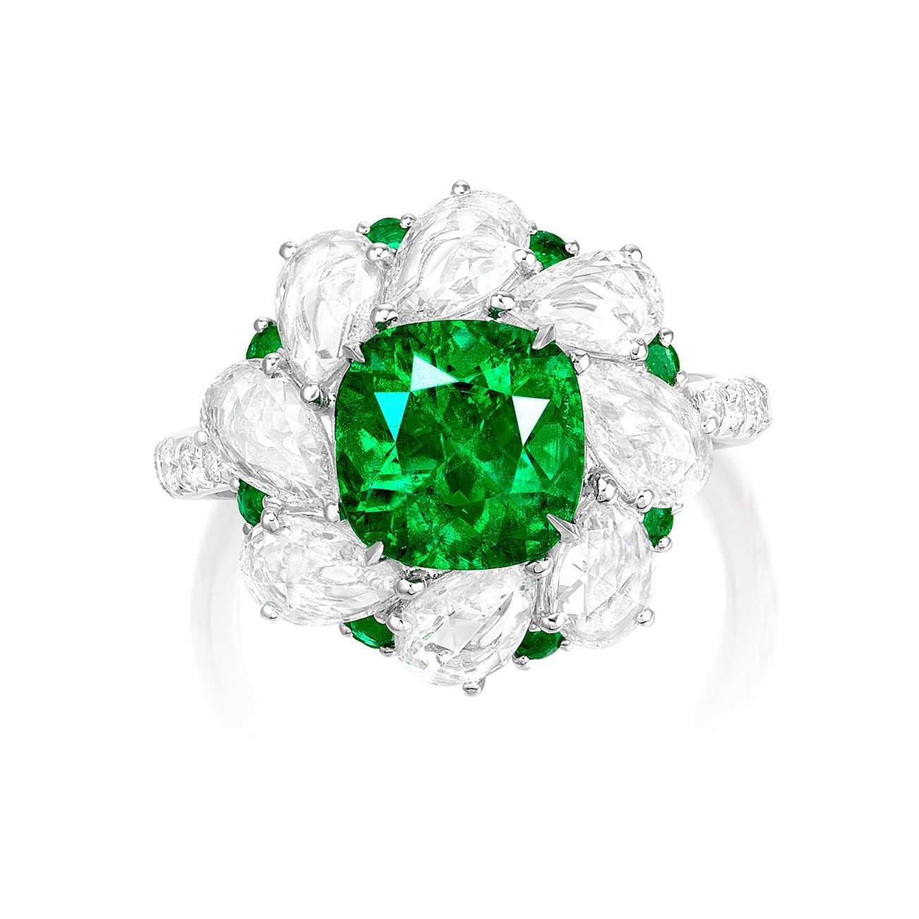 - Eight circular-cut emeralds surround, 0.23 carat total