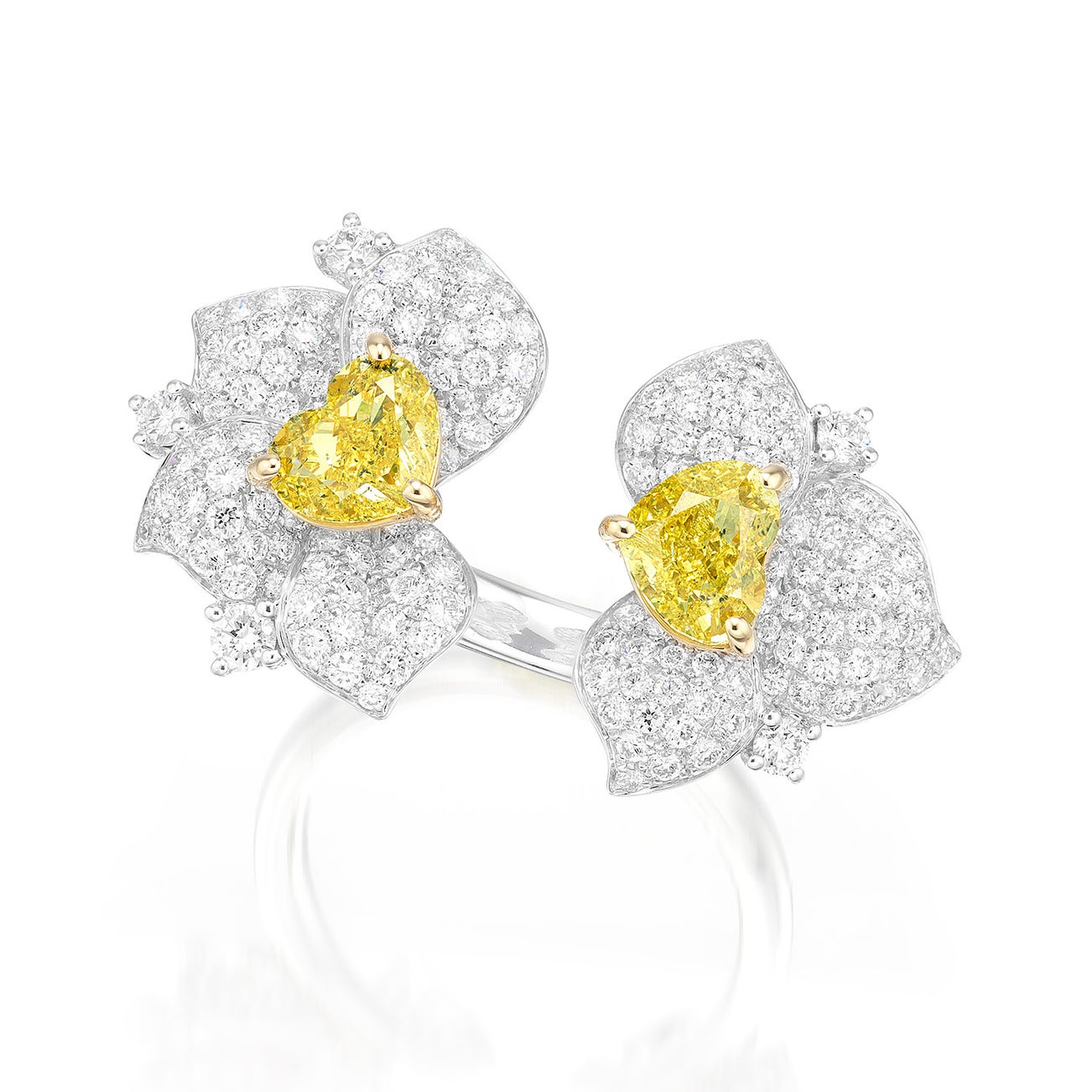 - Two heart-shaped Fancy Intense Yellow diamonds, 1.01 and 1.01 carats respectively