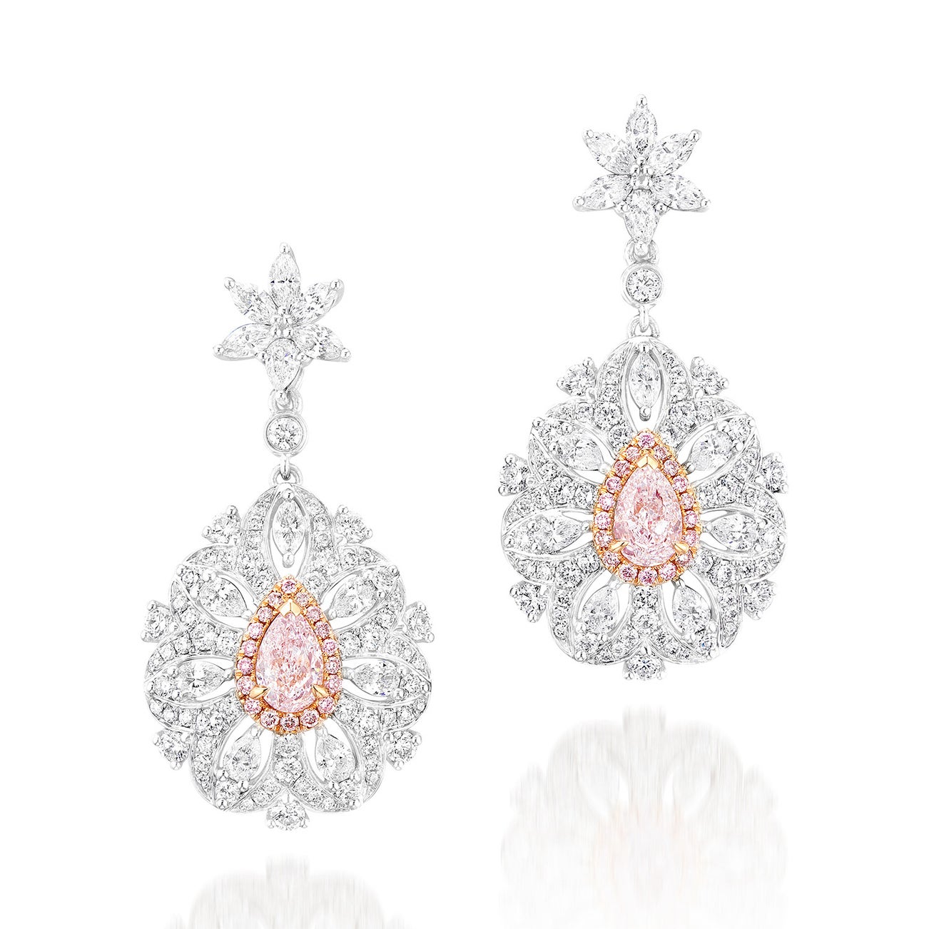 - Two pear-shaped Faint Pink diamonds, 0.31 and 0.33 carats respectively