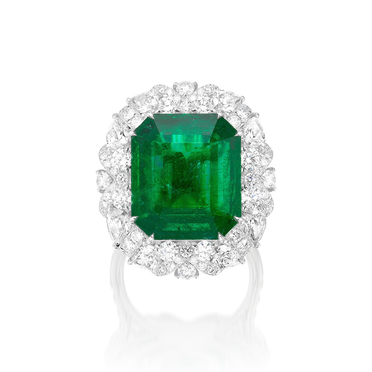 - Brilliant-cut diamonds and pear-shaped diamonds surround and shoulders, 3.81 carats total