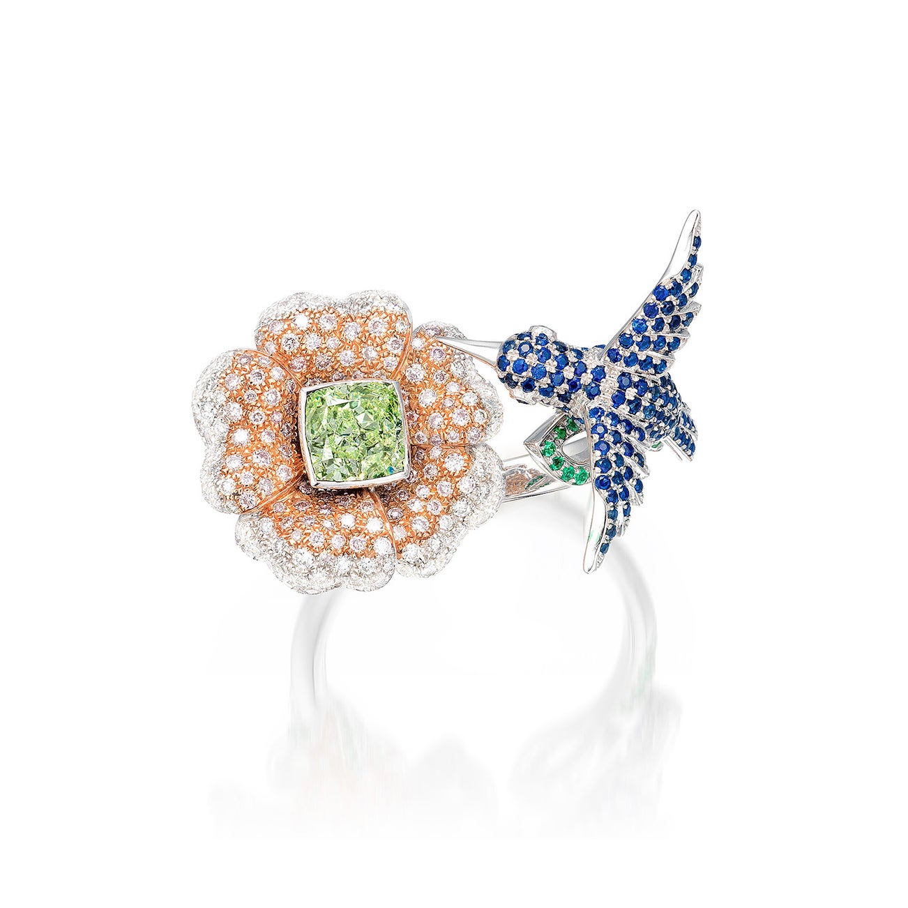 - Enhanced by circular-cut sapphires and emeralds, 1.02 carats total