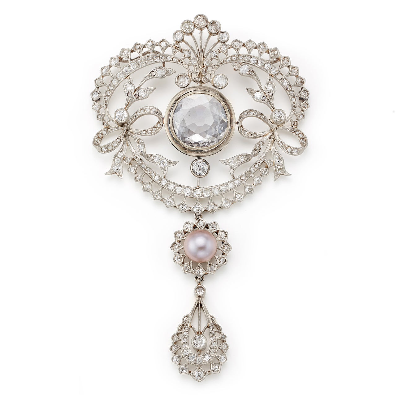 An Edwardian Faint Pink Diamond, Diamond, Natural Pearl, and Platinum Pendant