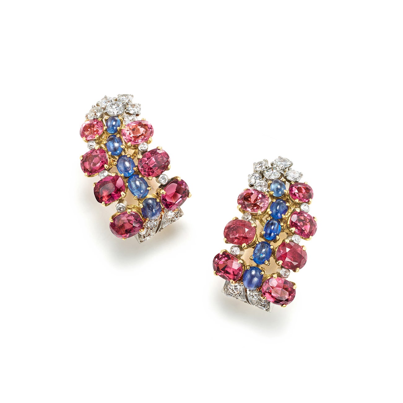 A Pair of French Tourmaline, Sapphire, Diamond, Platinum and Gold Earclips