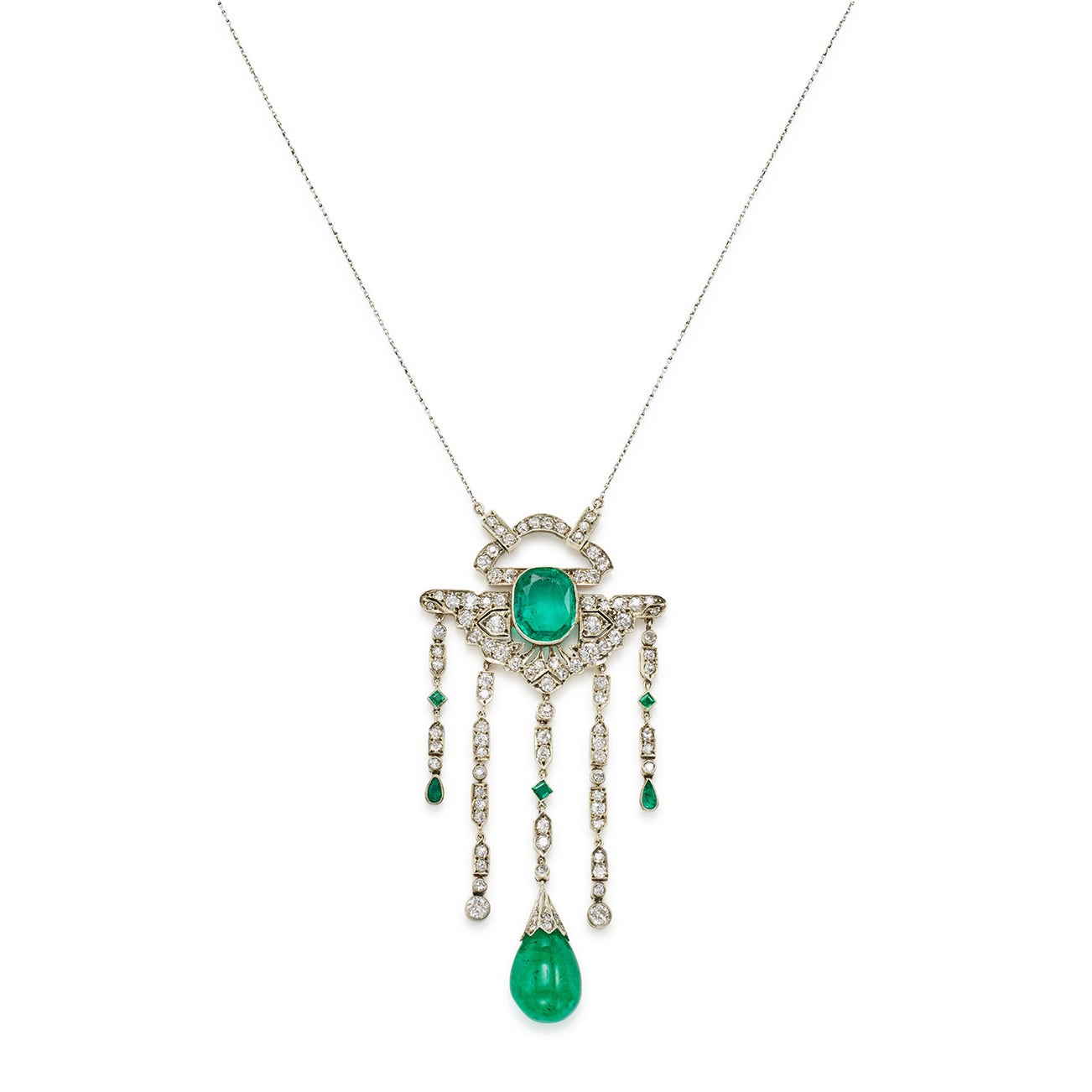 An Antique Emerald, Diamond, and Silver-Topped Gold Pendant Necklace