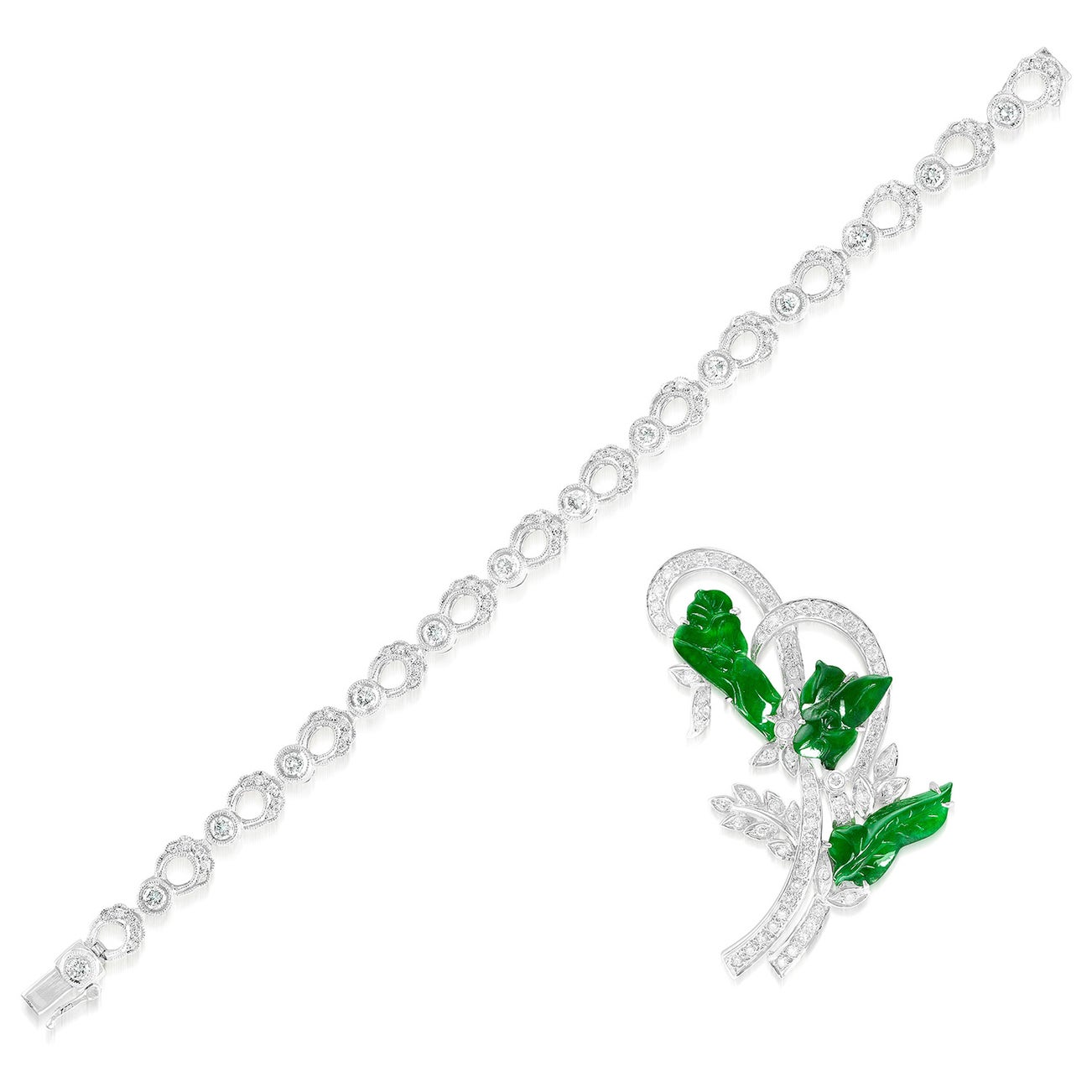 A Carved Jadeite and Diamond Brooch and A Diamond Bracelet