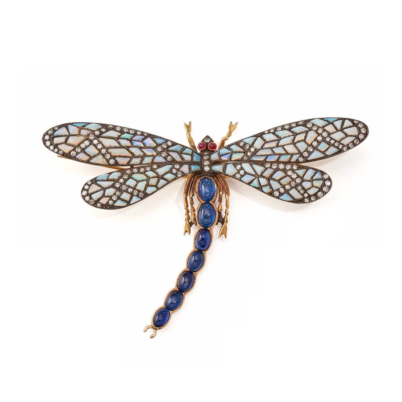 A Sapphire, Opal, Moonstone, Diamond, Ruby, and Silver-Topped Gold Brooch