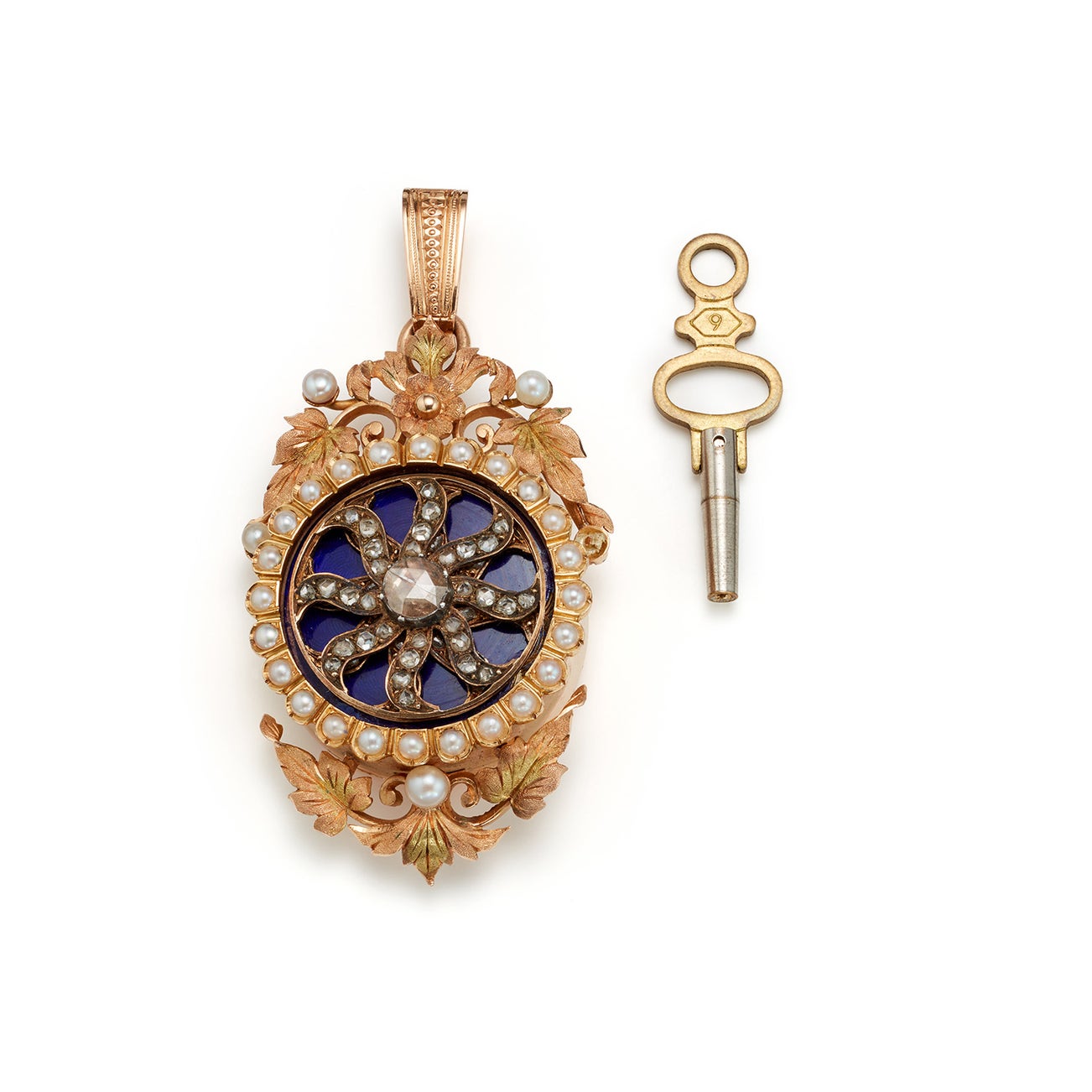 A Victorian Diamond, Seed Pearl, Enamel, Silver, and Gold 'Automaton' Pendant