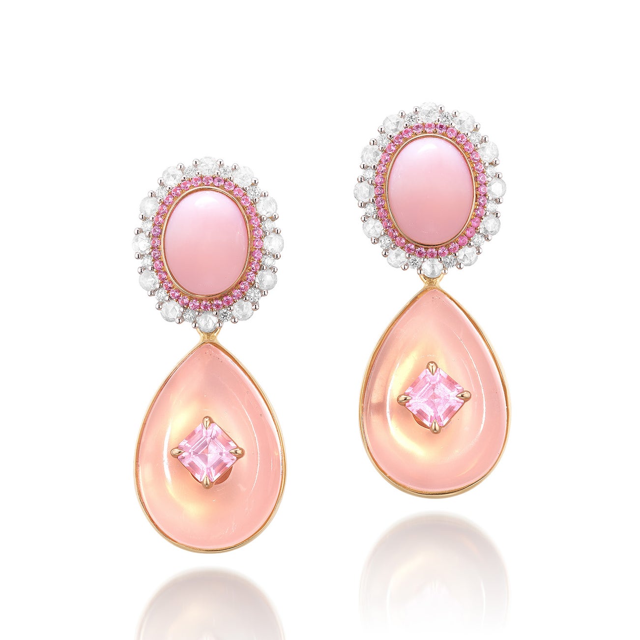 - Two oval-shaped pink opal cabochon surmounts, 4.51 carats total, surrounded by diamonds and pink sapphire detail