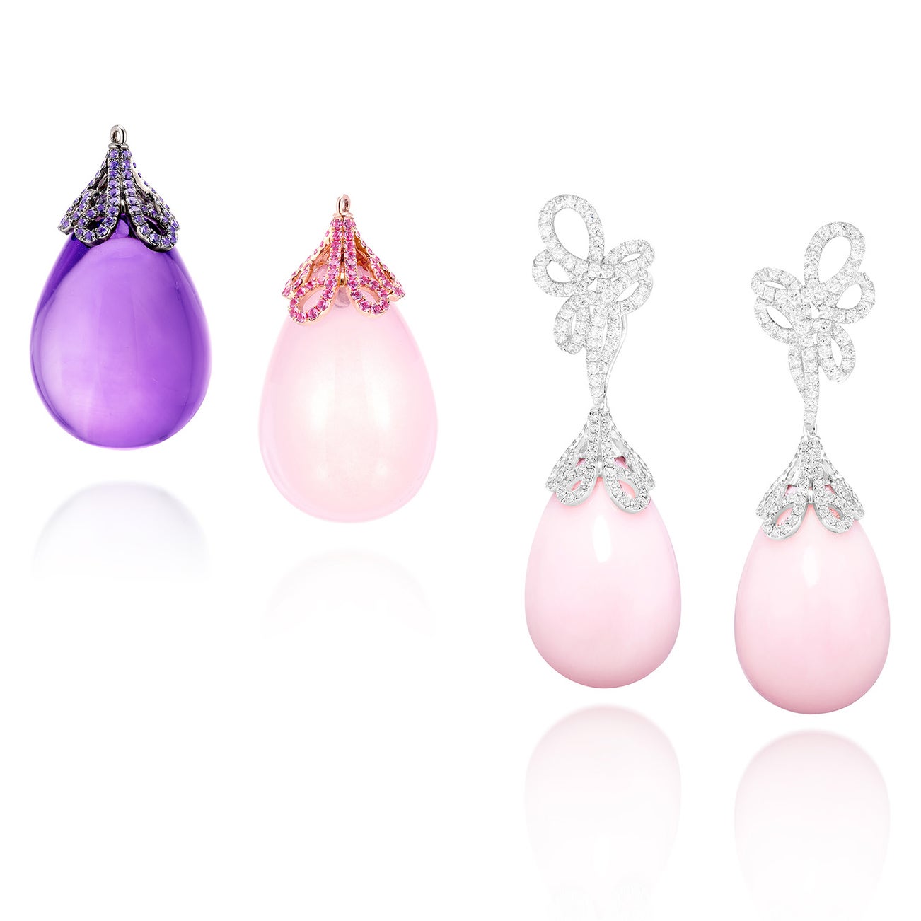 - One drop-shaped cabochon rose-quartz with pink sapphire cap, 54.58 carats