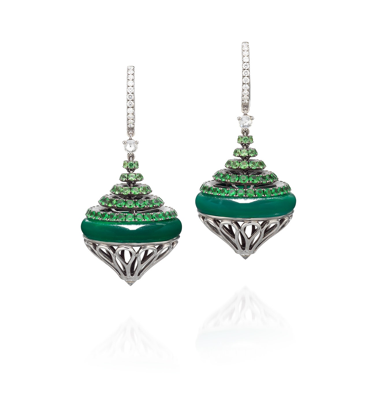Each of spiral motif, top set with five tiered circular cut green chalcedony, to the white gold openwork bottom, accented by circular-cut tsavorite garnets and an inversely-set aquamarine, suspended by a diamond-set hook, mounted in oxidized white gold, post and hinged back fittings.
