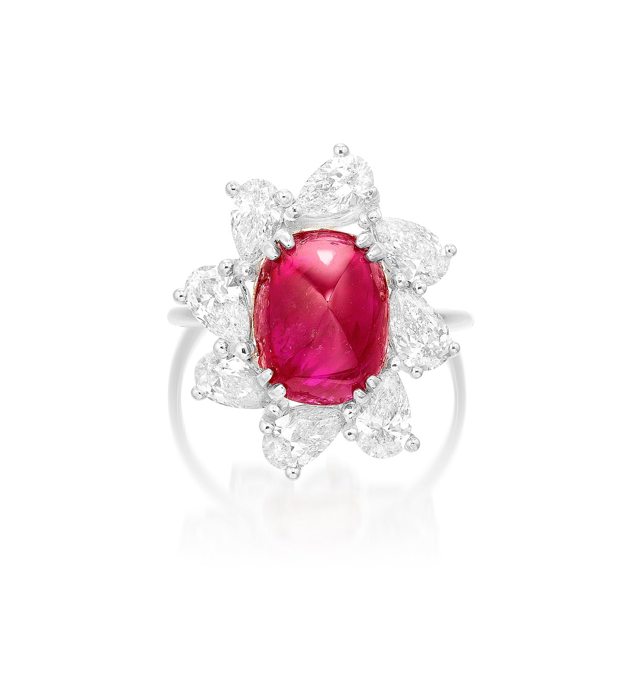 - Surrounded by pear-shaped diamonds, 1.63 carats total