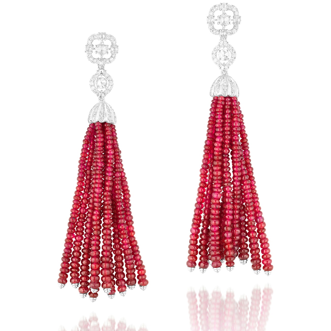 A Pair of Ruby Beads and Diamond Tassel Earrings