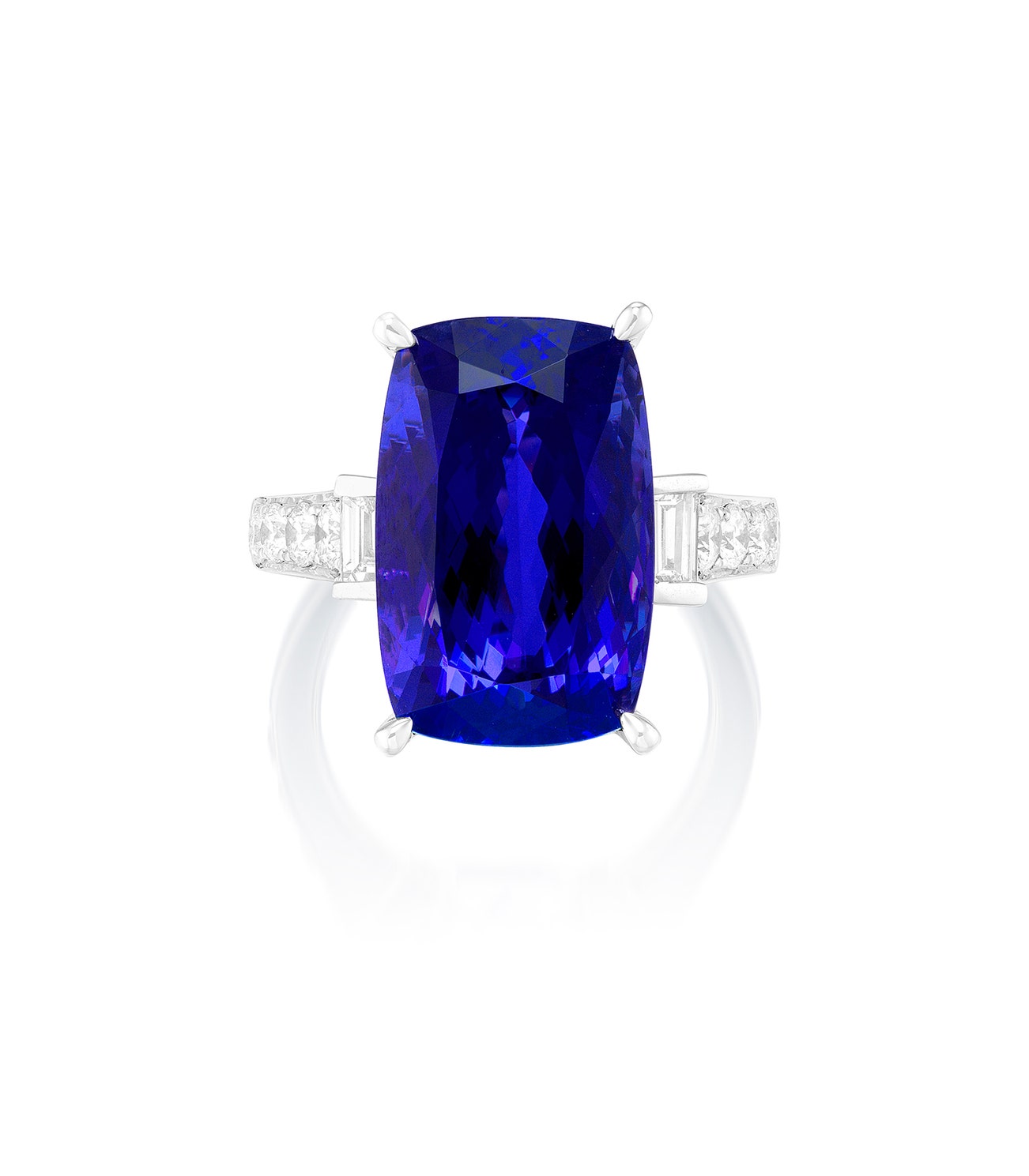 - Set with a cushion-shaped tanzanite, 16.32 carats