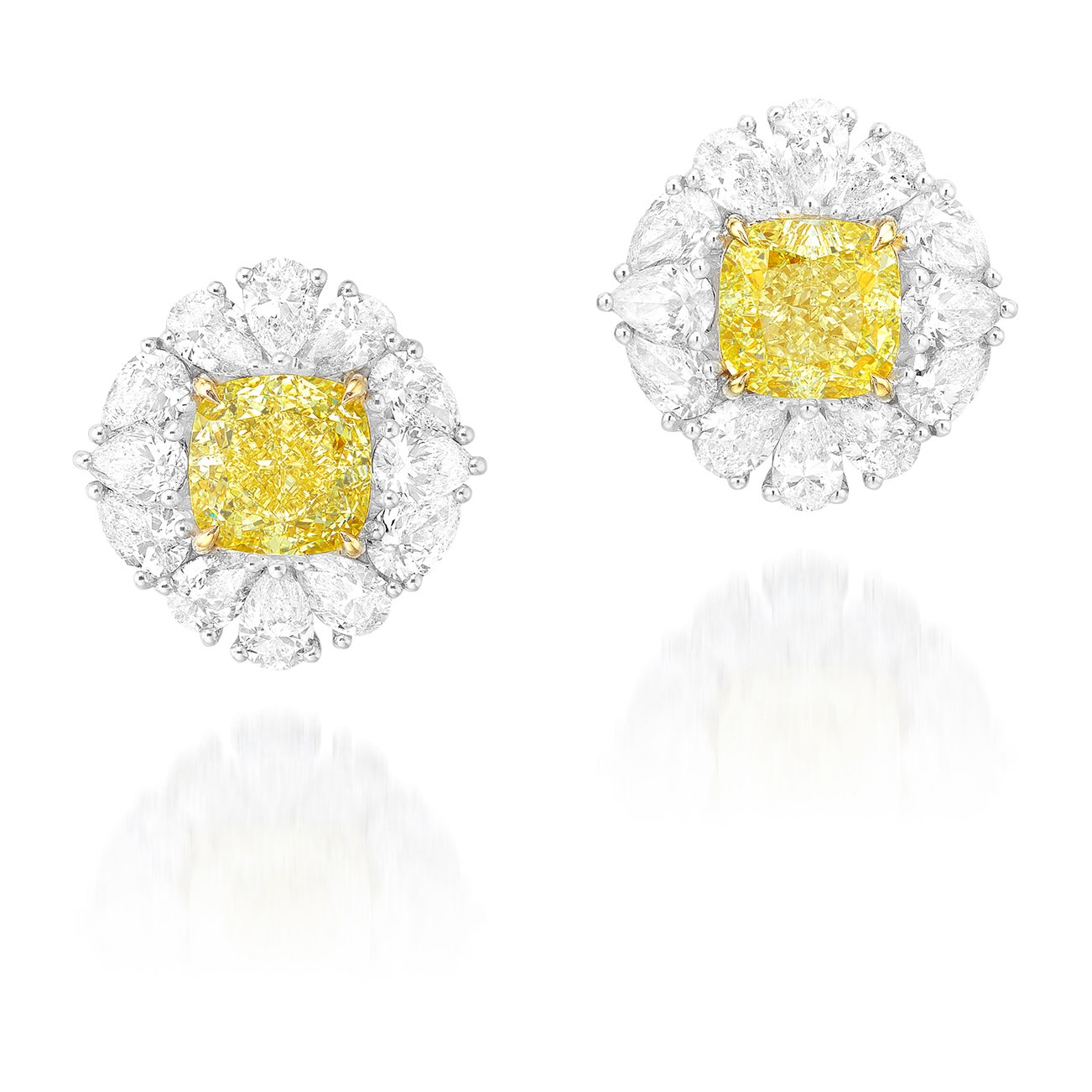 - Each set with a cushion-shaped fancy yellow diamond, 2.02 carats and 2.06 carats respectively