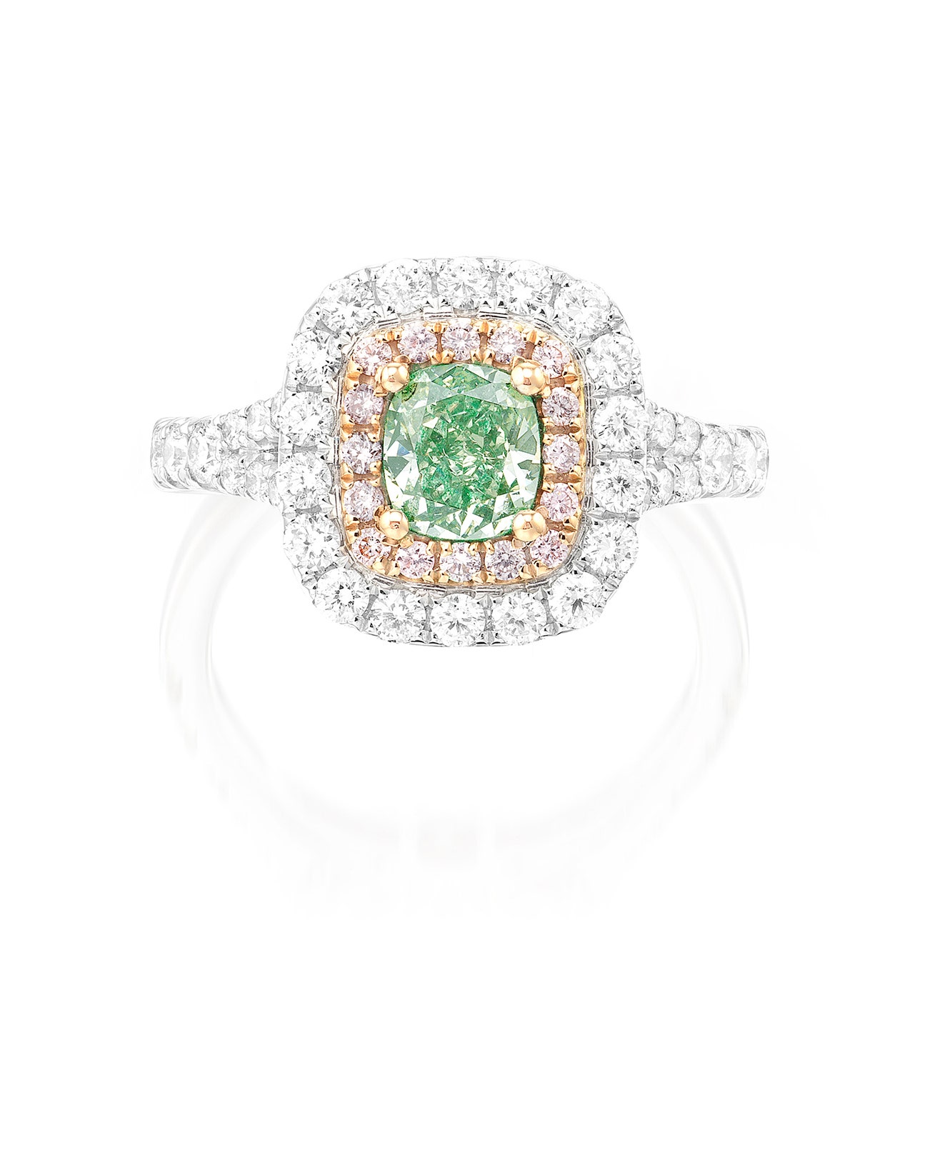 - Set with a cushion-shaped of green tint diamond, 0.86 carat