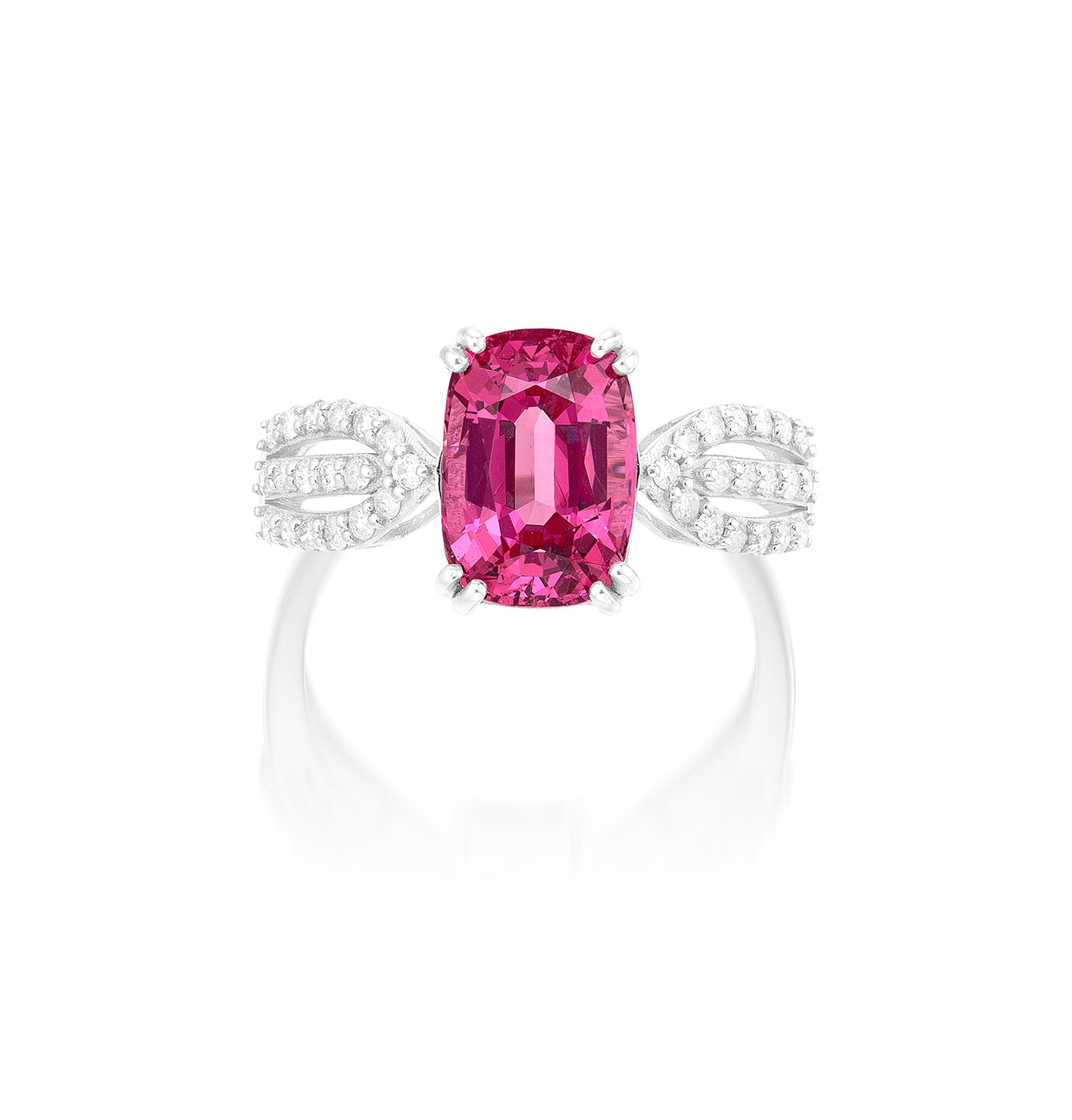 - Set with a cushion-shaped pink spinel, 3.03 carats