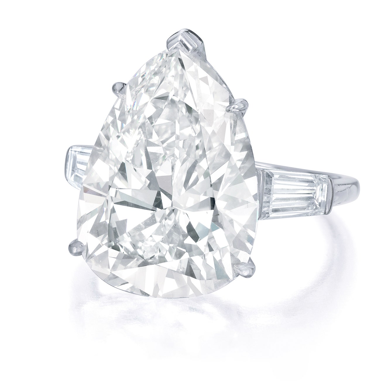 Set with a pear-shaped diamond weighing 15.15 carats, between tapered baguette diamonds, mounted in platinum, size 7.25.