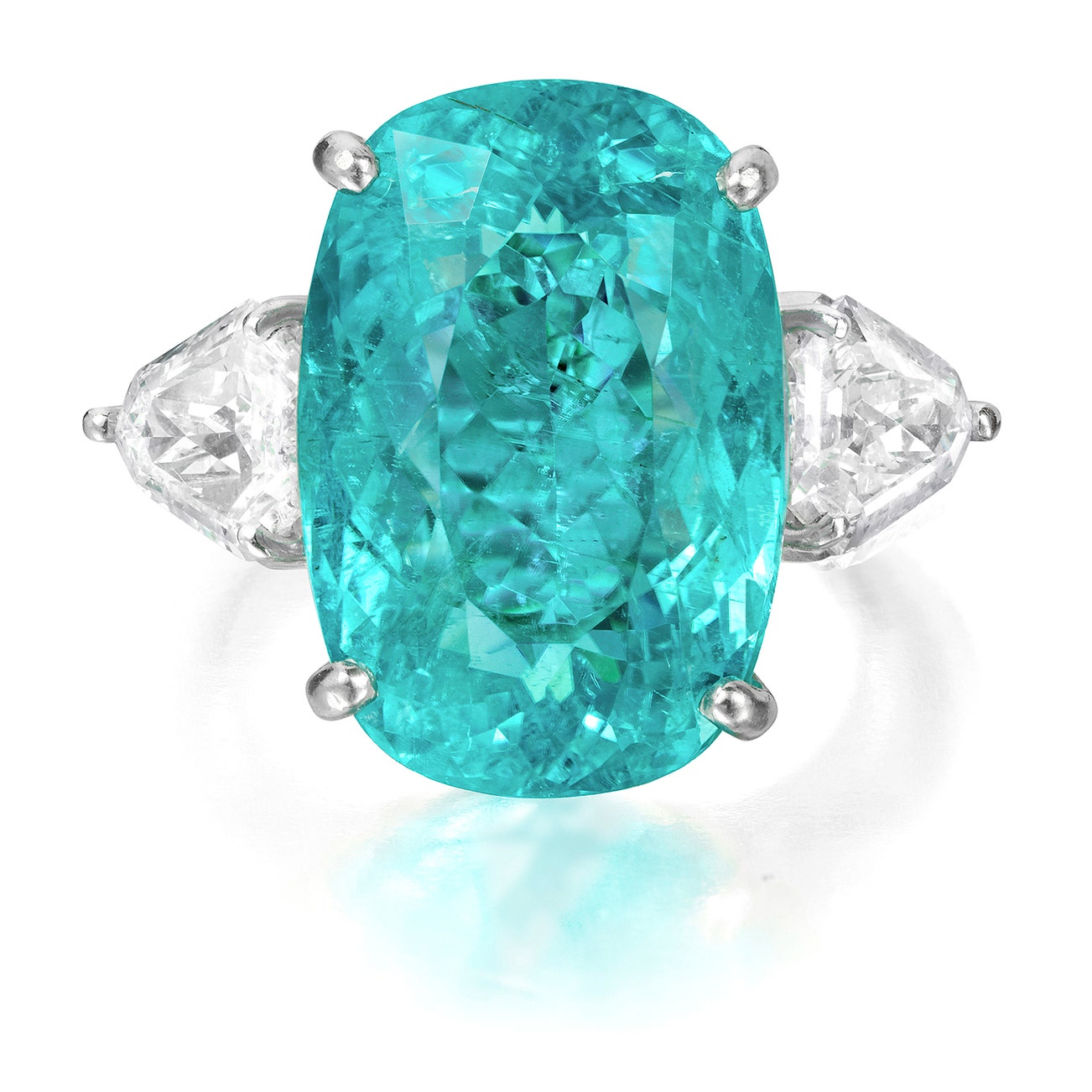 Set with a cushion-shaped Paraiba-type tourmaline weighing 16.32 carats, between shield-cut diamond shoulders, mounted in 18k white gold, size 6.