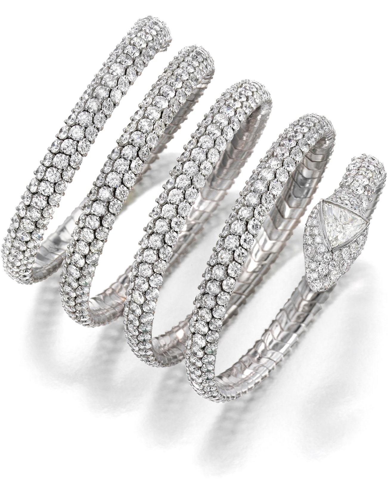Modeled as a snake, set with a trillion-cut diamond accented by brilliant-cut diamonds, mounted in 18k white gold, inner circumference approximately 6 inches, expandable.