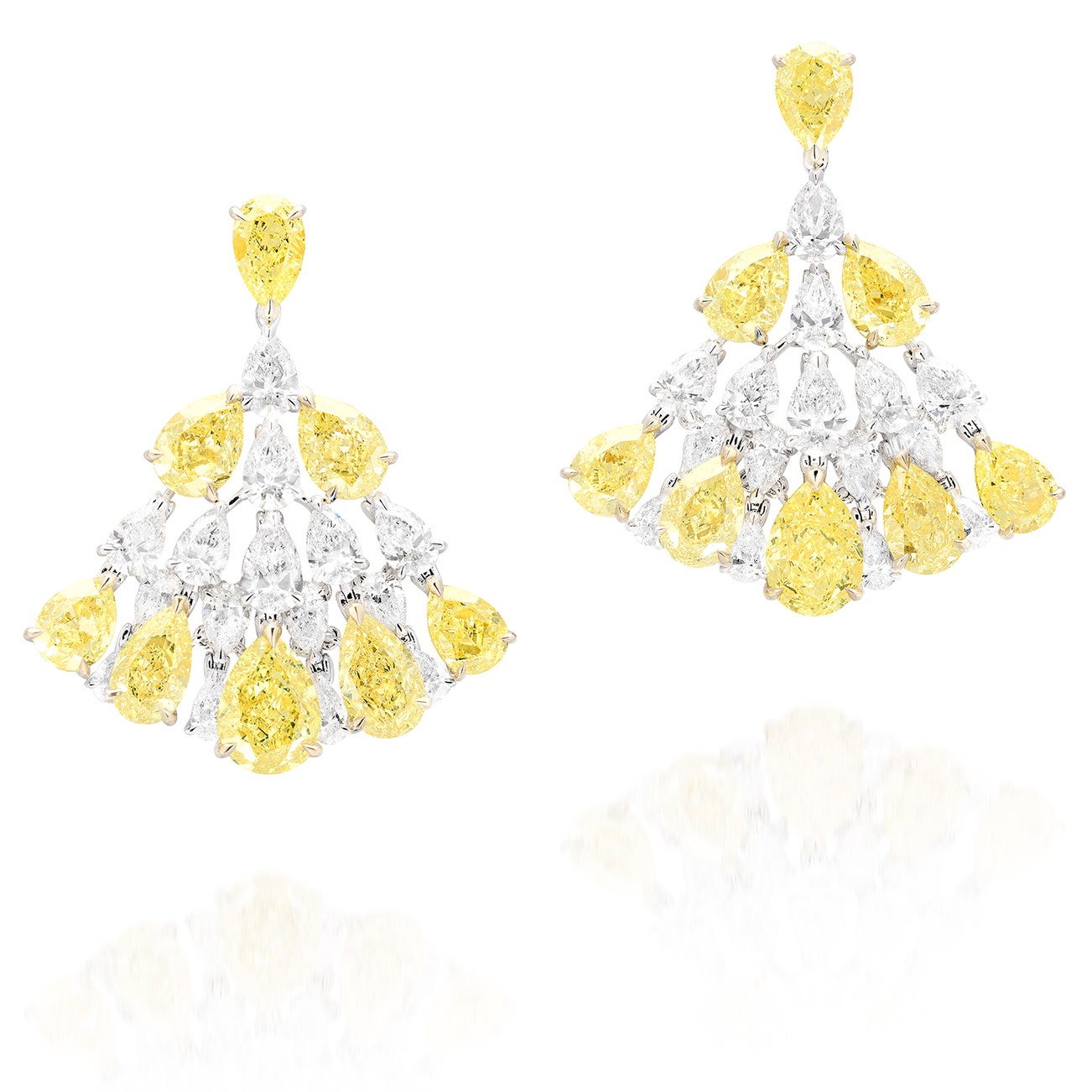 Each of fringe design, set with pear-shaped fancy light yellow and fancy yellow diamonds and near colourless diamonds, mounted in white gold and gold, post and butterfly fittings.