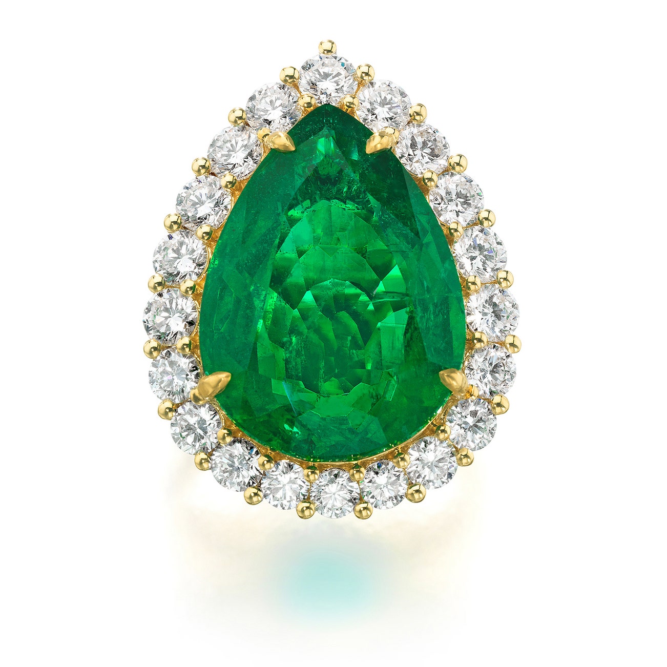 Set with a pear-shaped emerald weighing 17.86 carats, framed by brilliant-cut diamonds, mounted in 18k yellow gold, size 7.5.