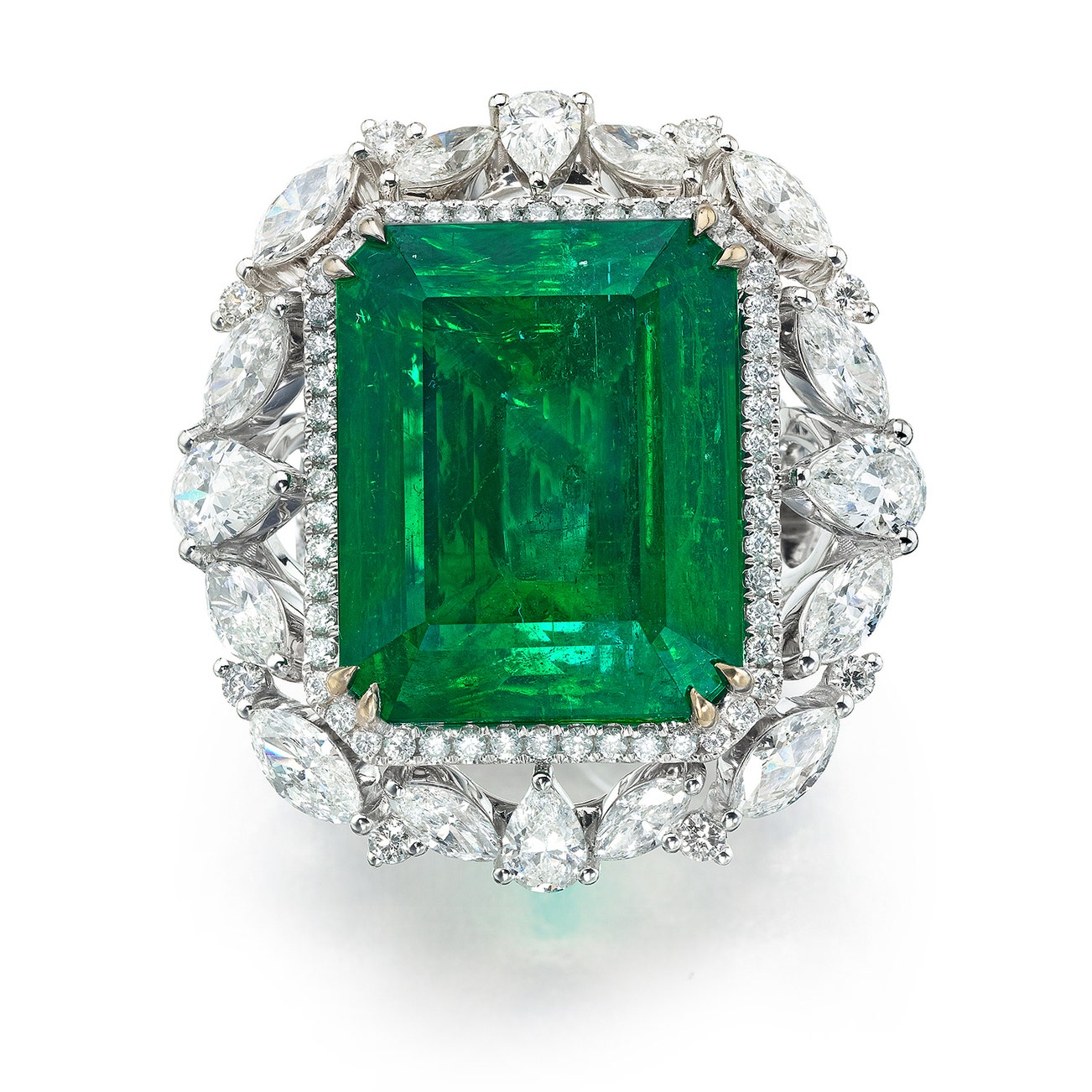 Set with a step-cut emerald weighting 26.12 carats, accented by brilliant-cut pear-and marquise-shaped diamonds, mounted in 18k white gold, size 6.5.