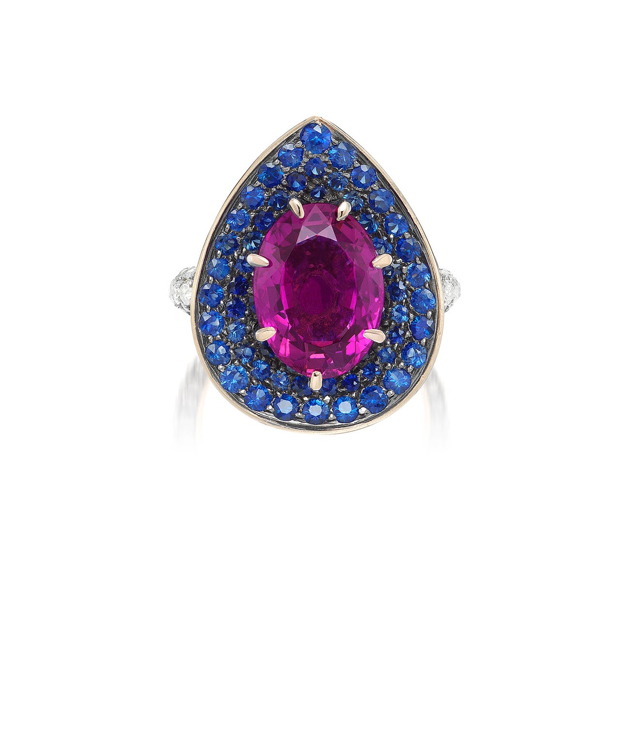 Set with an oval pink sapphire weighing approximately 5.45 carats, within a circular-cut sapphire around, the mount set with brilliant-cut diamonds, mounted in pink gold, size 6.
