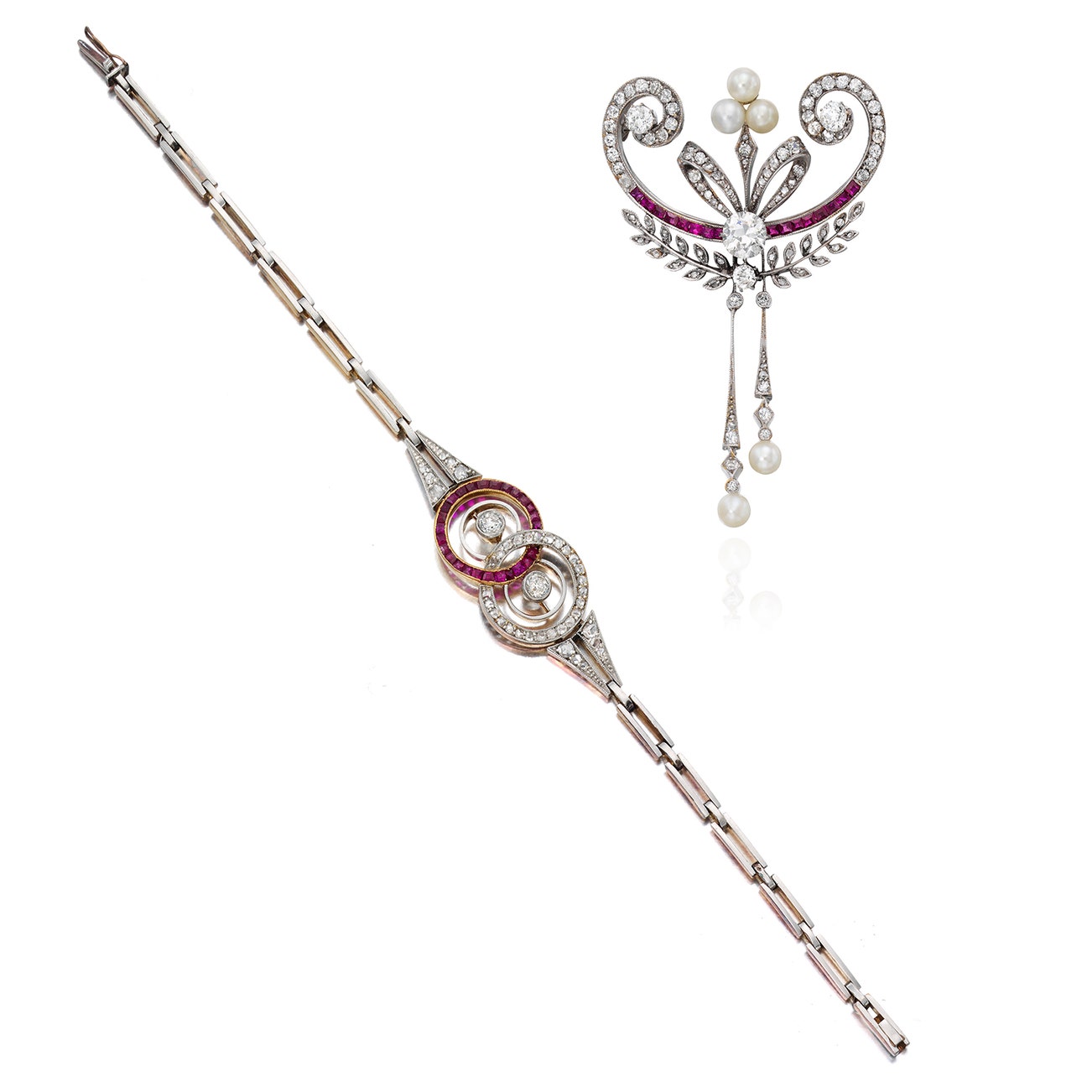 Comprising a bracelet of two interlocked circles of rose-cut diamonds and calibré-cut rubies, centering old-cut rubies, mounted in platinum topped 14k yellow gold, length approximately 6 5/8 inches; and a foliate scroll brooch set with an circular-cut diamond, accented by single-, old-cut diamonds, calibré-cut rubies, and button pearls, mounted in 18k white gold.