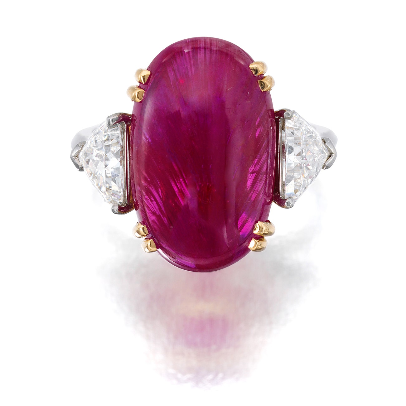 Set with an oval cabochon ruby weighing 12.34 carats, between two triangular-shaped diamonds, mounted in platinum and 18k yellow gold, size 5.5.