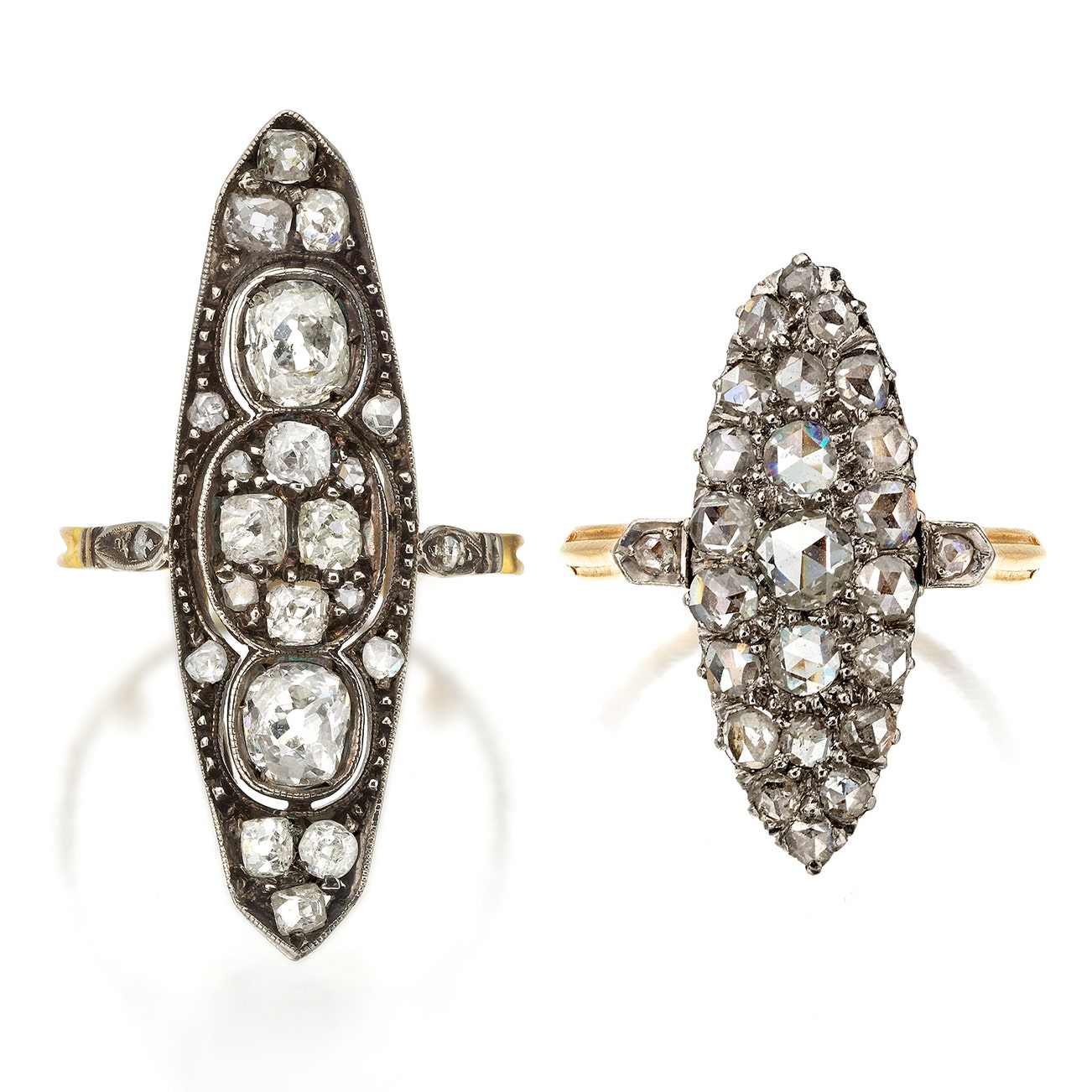 Comprising two navette-shaped rings, one set with rose-cut diamonds, mounted in 18k yellow and white gold, size 7.5; the other set with cushion-shaped and rose-cut diamonds, mounted in silver topped 18k gold, size 4.5 French import marks for 18k gold and silver.