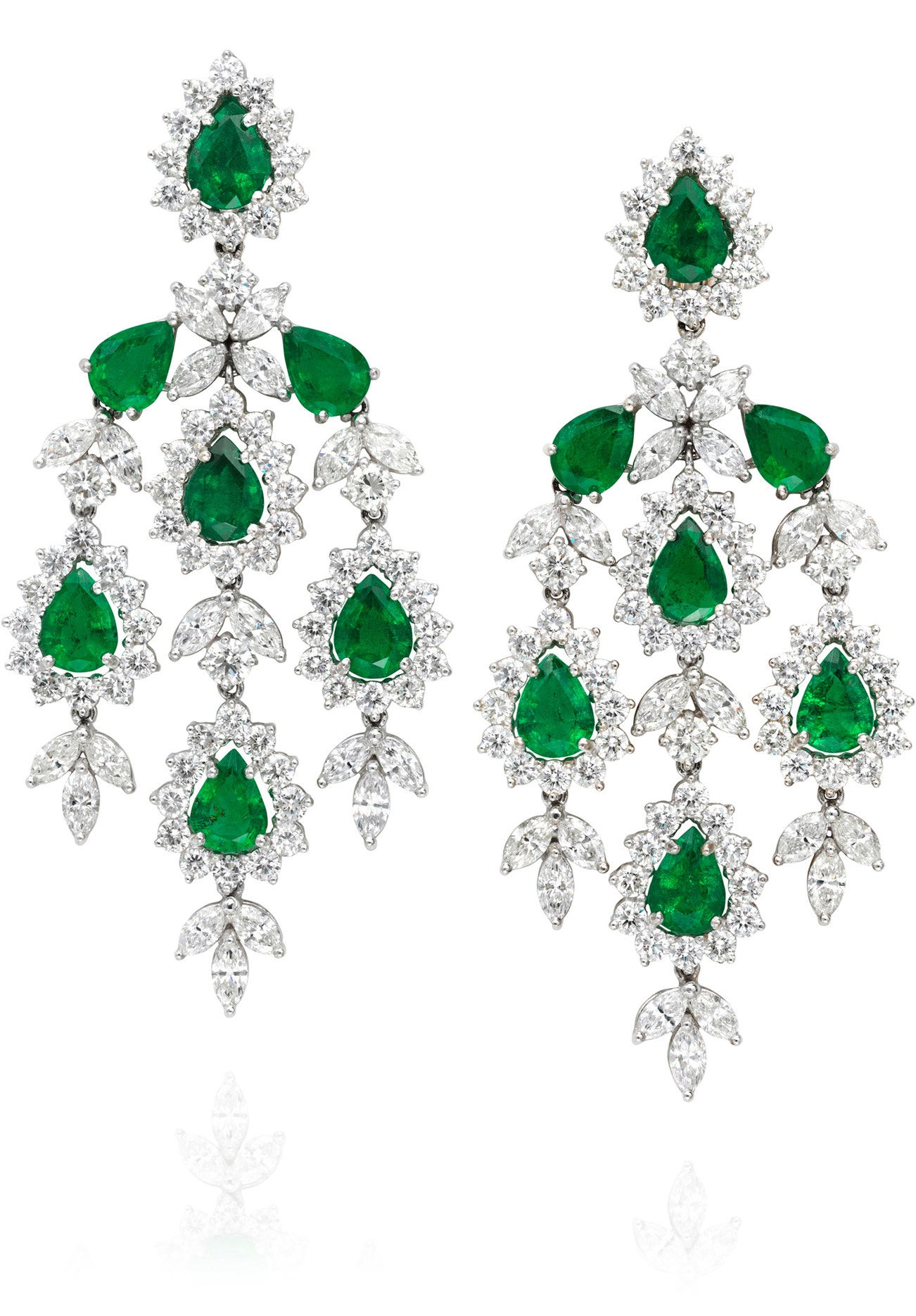 Of girandole design, each set with pear-shaped emeralds, accented by brilliant-cut and marquise-shaped diamonds, mounted in 18k white gold, omega clips with fold-down posts.
