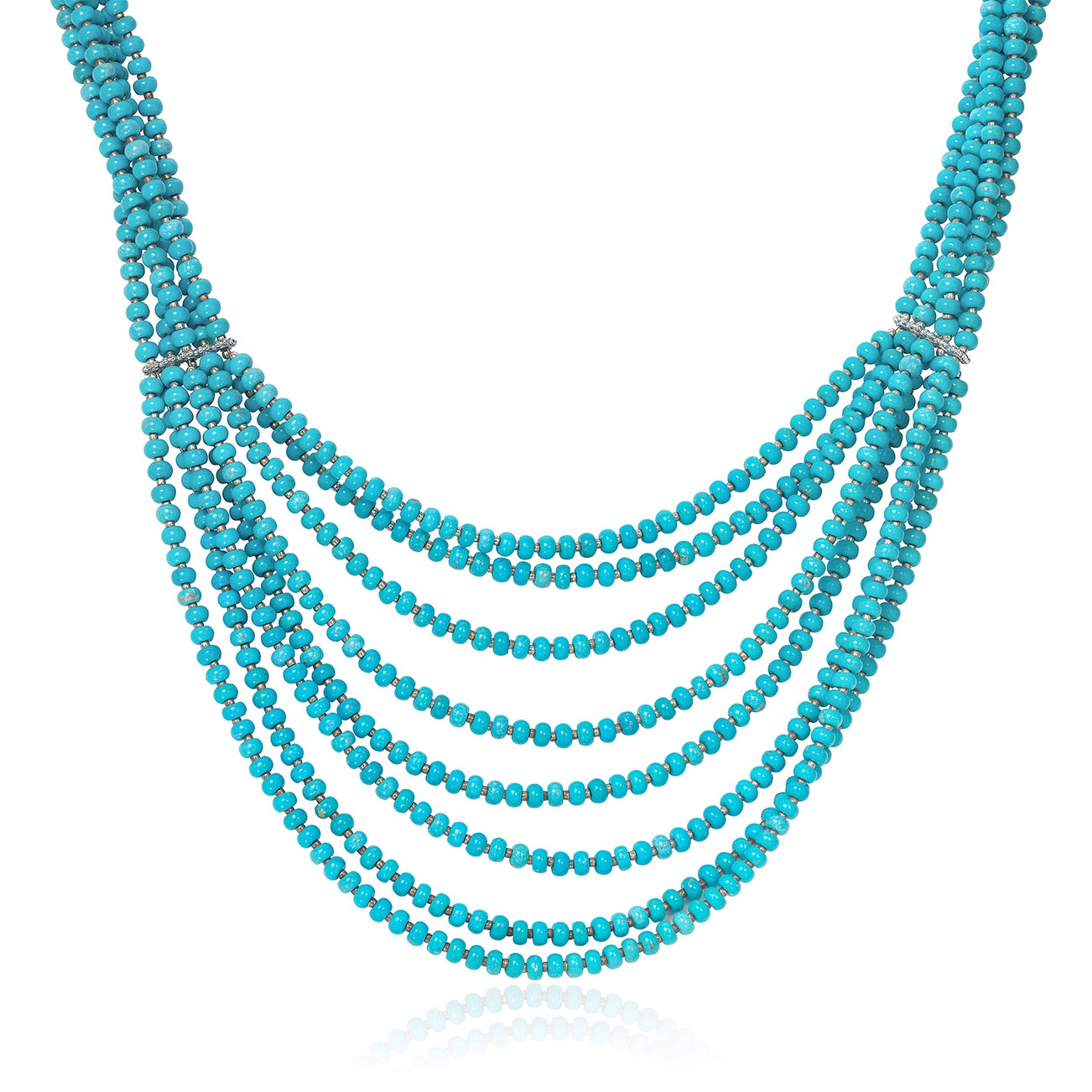 Designed as five rows graduating to eight rows in the center of turquoise beads spaced by silver beads, mounted in silver, length approximately 25 inches.