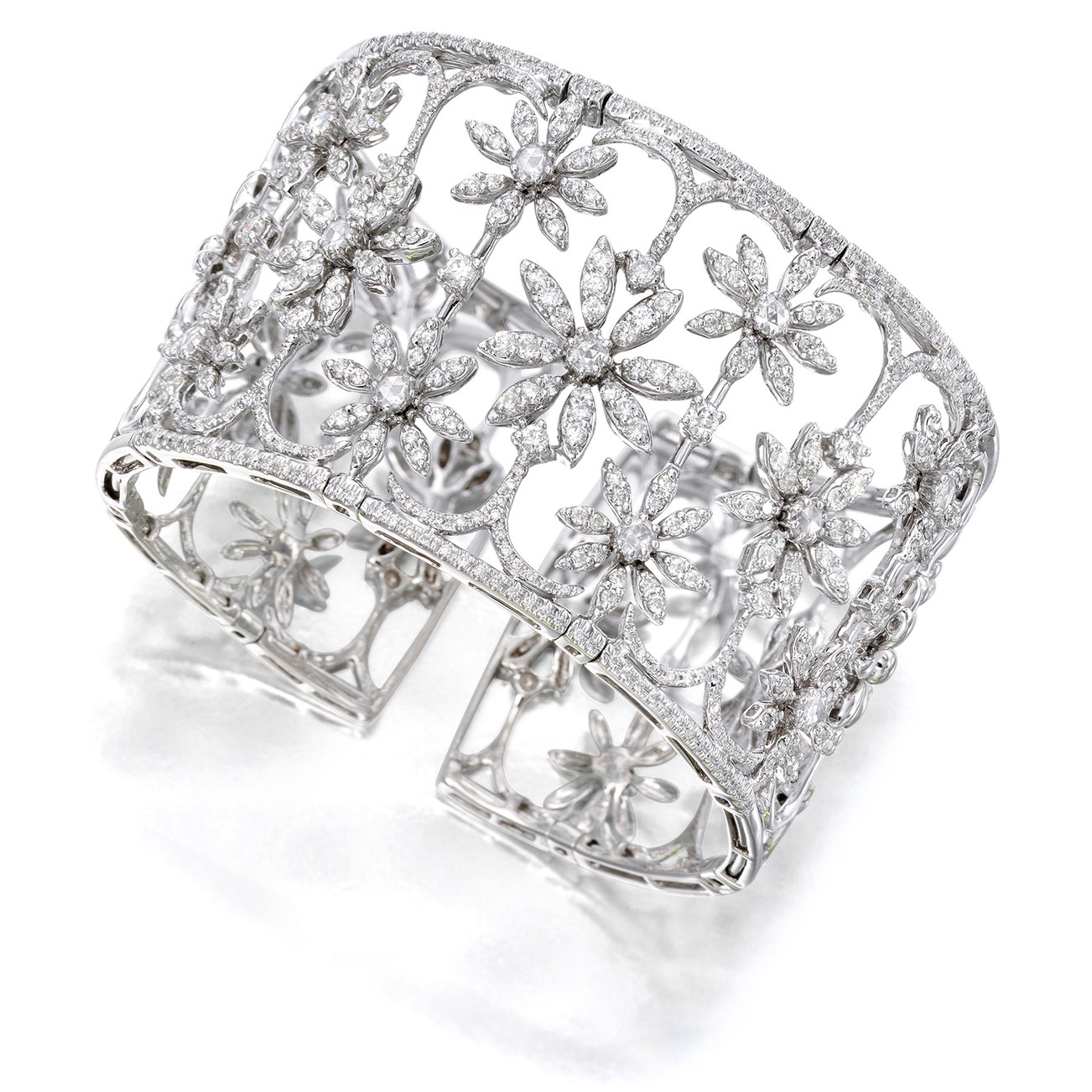 designed as staggered flowers set with a rose-cut center and brilliant-cut diamond set petals, accented by brilliant-cut diamond trellis work, mounted in 14k white gold, inner circumference approximately 6 3/8 inch.