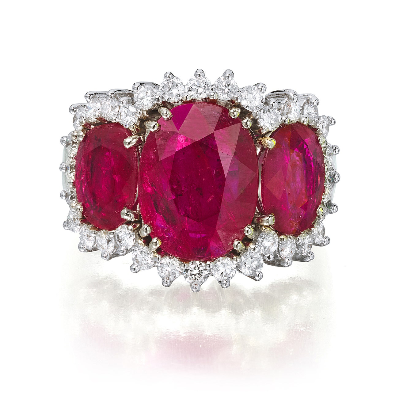 Set with three cushion-shaped rubied surrounded by brilliant-cut diamonds,