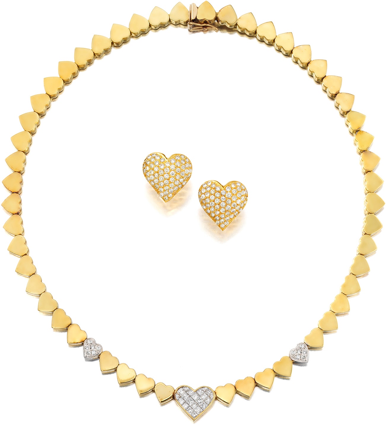 Comprising a pair of hear-shaped earrings set with brilliant-cut diamonds, mounted in 18k yellow gold, with posts and hinge back fittings; and a heart shaped link necklace centering a calibré-cut diamonds, between two links set with brilliant-cut diamonds, mounted in 18k yellow and white gold, length approximately 15 inches.