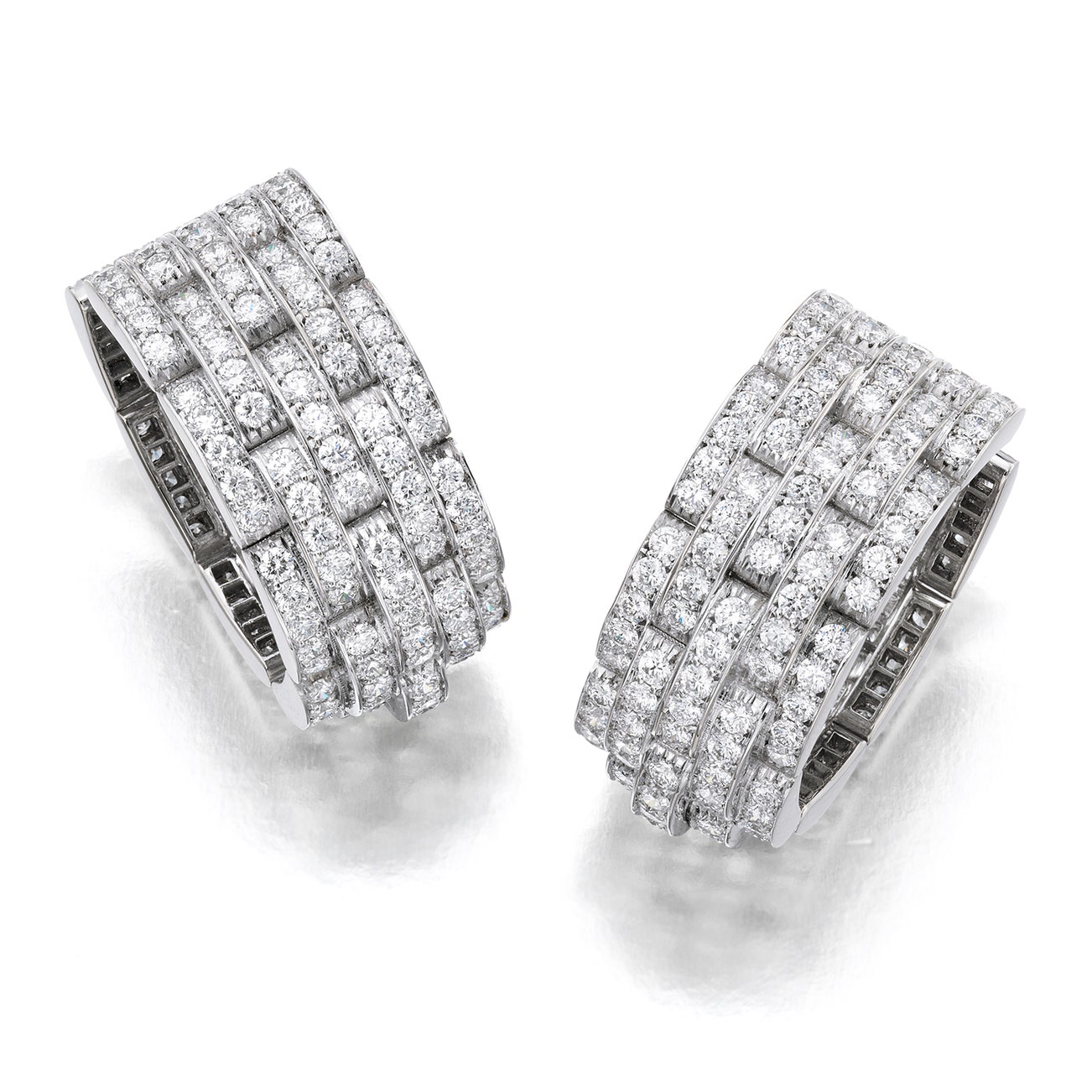 Each set with brilliant-cut diamonds, mounted in 18k white gold, posts with hinged tension catch.